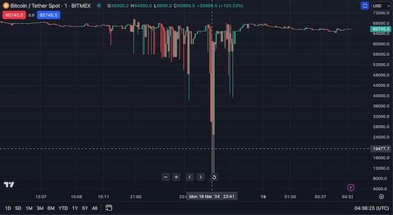 Large sell orders worth $55.49 million drove bitcoin’s price down to $8,900 on BitMEX. The overnight crash was short-lived. The price crash on BitMEX occurred on the XBT/USD spot market late Monday. BitMEX said on X that it is investigating the large sell orders that caused the flash crash. Yes, you read the title right. Late Monday, bitcoin (BTC) suffered a brief crash to as low as $8,900 on cryptocurrency exchange BitMEX, while prices on other exchanges held well above $60,000. The slide began at 22:40 UTC, and within two minutes, prices fell to $8,900, the lowest since early 2020, according to data from the charting platform TradingView. The recovery was equally quick, with prices rebounding to $67,000 by 22:50 UTC. Throughout the boom-bust episode on the BitMEX's spot market, BTC’s global average price was around $67,400. Some observers on social media platform X allege that whale selling catalyzed the price crash. According to @syq, someone sold over 850 BTC ($55.49 million) on BitMEX, driving the XBT/USDT spot pair down to $8,900. The BitMEX XBT index tracks bitcoin’s price, while the XBT/USDT pair represents bitcoin’s tether-denominated price. Tether is the world’s leading dollar-pegged stablecoin. While the spot market crashed, BitMEX's billion-dollar derivatives markets held steady. Following the crash, BitMEX said on social media that it is looking into the large sell orders. “We launched an investigation as soon as we saw unusual activity on our BTC-USDT Spot Market. All of our systems were operating as normal, but we identified aggressive selling behavior involving a very small number of accounts widely beyond expected market ranges. We can’t comment on any specific behavior of a user or actions taken, and we continue to investigate,” BitMEX said in a statement. “The trading platform is operating as normal, and all funds are safe,” BitMEX added. https://www.coindesk.com/markets/2024/03/19/bitcoin-flash-crashed-to-89k-on-bitmex/