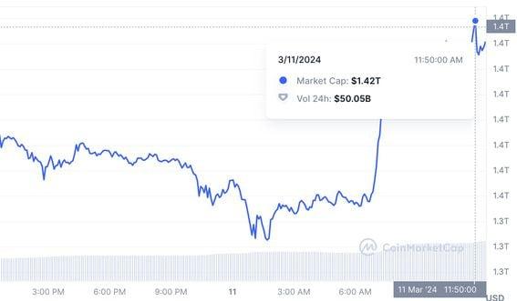 Bitcoin jumped to a record high on Monday, fuelled by continued positive momentum of the spot ETFs. Bitcoin continues to rise in the ranks of top assets by market cap, pushing past silver to become the world's eighth most valuable property. With a 4% advance to an all-time high past $72,000 in the morning hours of U.S. trading, bitcoin's (BTC) valuation shot to $1.42T, above that of sliver at $1.387T, according to CompaniesMarketCap. Earlier in this historic bull run, bitcoin pushed ahead of the market cap of Meta (formerly known as Facebook), which now stands at $1.2 trillion. Next up in bitcoin's sight is the globe's seventh most valuable asset, Google parent Alphabet, whose current valuation is just shy of $1.7 trillion. Some bitcoin bulls have their sights set on the world's most valuable property – gold and its $14.7 trillion market cap. To get there, bitcoin would have to rise more than 10-fold, or past $720,000 per token. “The robust price action continues to be fueled by the positive momentum of BTC Spot ETFs,” said Matteo Greco, research analyst at Fineqia Capital, in a morning note. To that point, the London Stock Exchange Monday decided to accept applications for bitcoin and ether exchange-traded notes (ETNs). https://www.coindesk.com/markets/2024/03/11/bitcoins-market-cap-jumps-to-14t-surpassing-silver/