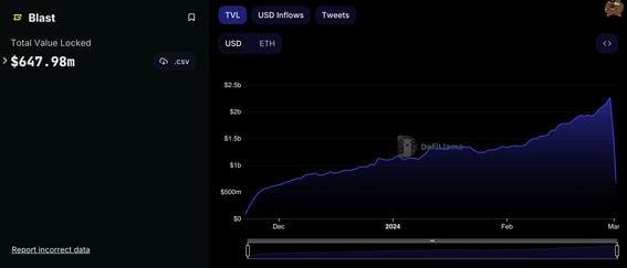 The controversial layer-2 network had taken $2.3 billion in deposits since November as it prepared for launch. What remains is now down to about $350 million, but many of the deposits in the original "farm" contract have now moved into a new Blast address. CORRECTION (19:08 UTC): An original version of this story misinterpreted data from DefiLlama to suggest that most of the funds in the original Blast deposit contract were withdrawn immediately after the network's launch this week. The funds were indeed withdrawn from the Blast contract, but further analysis shows that most of the funds were just moved to a new address associated with Blast's mainnet, not withdrawn from Blast entirely. Investors who had staked ether (ETH) on Blast, a layer-2 network atop Ethereum that launched Thursday, have bridged many of those assets over to another Blast address, "ETH Yield Manager." Early data from DefiLlama data showed that, as of early Friday, some $1.6 billion of assets were moved out of the original Blast deposit contract. The amount remaining in the original contract was down to about $350 million at press time. Blast posted on X on Thursday that "early access users can bridge to Mainnet and use Blast-native Dapps that don’t exist anywhere else." As of early Friday, a new Blast address labeled "ETH Yield Manager" held some $1.8 billion of stETH tokens; stETH tokens represent ether (ETH) that has been deposited into Lido, which "stakes" tokens with Ethereum and rewards interest to users. (Staking tokens is the main part of Blast's strategy for rewarding yields to users.) The movement comes months after Blast, promising on its website to be the "only Ethereum L2 with native yield," announced a deposit-only bridge in November that quickly garnered more than $2 billion in inflows. Depositors received Blast "points" for holding their ETH on Blast, and the assumption is that the points could eventually be redeemed for a token airdrop; in crypto trading, the pursuit of these points is known as "points farming." Backed by the crypto-focused venture firm Paradigm, Blast initially polarized crypto investors, with several observers claiming that it resembled a pyramid scheme due to its controversial one-way bridge. Others simply called out the less-than-ideal optics of a project soliciting deposits and disabling withdraws while its technology remained under development. Yet in spite of skepticism, Blast rapidly became one of the most active layer-2 networks in terms of deposits even before the mainnet had gone live. It attracted $2.3 billion in deposits from 181,000 users, generating an annual yield of $85 million. The Blast ecosystem experienced its first exit scam earlier this week, with a protocol named "RiskOnBlast" disappearing along with $1.3 million worth of ether. Several projects have added Blast integrations, with NFT platform Zora and pricing oracle provider Pyth announcing their support on Thursday. Developers that create decentralized apps (dApps) on Blast are supposed to receive 50% of the upcoming airdrop allocation. https://www.coindesk.com/business/2024/03/01/blast-hyped-layer-2-chain-sees-most-deposits-bridge-to-yield-manager/