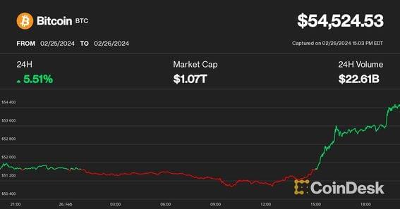 Bitcoin could target $58,000 after the breakout, Swissblock analysts suggested. Bitcoin topped $54,000 Monday, breaking through a key resistance level that capped prices since mid-February. SOL, MATIC, ATOM led altcoin gains, while crypto-focused stocks Coinbase, MicroStrategy, Marathon Holdings and Riot Platforms booked double-digit advances. Bitcoin's next short-term target is $57,000-58,000, Swissblock said. Bitcoin (BTC) topped $54,000 on Monday surging to its highest price since November 2021, leaving past its recent sideways range as the crypto rally suddenly resumed. The largest crypto by market cap broke through its major resistance level at $53,000 during mid-morning U.S. trading hours, which halted price rallies over the past two weeks, and quickly ran just shy of $55,000 by afternoon hours before slightly retraced, CoinDesk data shows. At press time, BTC was changing hands at $54,400, up nearly 5% over the past 24 hours. It outperformed the broad-market CoinDesk20 Index (CD20), which advanced 4%, topping the 2,000 level for the first time. Ether (ETH), the second-largest crypto asset, also rose nearly 4%, hitting a fresh 22-month high of $3,200. Solana's native token (SOL), Polygon's MATIC and Cosmos' ATOM led gains among major cryptocurrencies in the CD20 index, with 5%-7% advances. The crypto rally also lifted digital asset-focused stocks. Shares of crypto exchange Coinbase (COIN) and the Michael Saylor-helmed MicroStrategy (MSTR) both gained 17% during the day. Large-cap bitcoin miners Marathon Digital (MARA) and Riot Platforms (RIOT) booked 22% and 15% gains, respectively. Bitcoin targets $58,000 While some market observers anticipated that bitcoin could correct to $48,000 as it stalled, Monday's bounce was a decisive breakthrough of one of the last historically important resistance levels before record highs. "BTC now seems to finally break out from the range it has been in since Feb. 15," crypto analytics firm Swissblock said in a Telegram market update Monday. "The momentum is moving up strongly. All sails are set." Swissblock analysts added that the next level for bitcoin's price target is the $57,000-$58,000 range, with new all-time highs in sight after that. The move was also coupled with an uptick in bitcoin's price premium on Coinbase compared to other exchanges, suggesting demand coming from U.S. investors. U.S.-listed spot bitcoin exchange-traded funds (ETF) also experienced heavy trading interest, with BlackRock's IBIT booking its largest daily trading volume since its debut, TradingView data shows. However, ETF trading volumes do not always translate to inflows for the funds, an NYDIG report pointed out. https://www.coindesk.com/markets/2024/02/26/bitcoin-blasts-past-53k-as-crypto-rally-resumes/