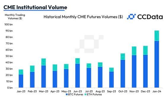 The total derivatives trading volume on CME rose 35% in January to $94.9 billion, the highest since October 2021. Derivatives giant Chicago Mercantile Exchange (CME) witnessed a surge in trading volume in January as the U.S. saw spot bitcoin exchange-traded funds (ETFs) win Securities and Exchange Commission (SEC) approval. The total derivatives trading volume on CME rose 35% in January to $94.9 billion, according to data provided by CCData. This is the highest recorded trading volume for the exchange since October 2021. January saw the much-anticipated approval of spot bitcoin ETFs in the U.S, an important milestone for institutional investors as the products offer them exposure to the world’s largest cryptocurrency by market value. CME is a Chicago-based firm whose business covers a wide span of financial, commodity and agricultural futures and options. Large institutions use CME to trade bitcoin futures. Futures are a type of derivatives contract that requires buyers to purchase bitcoin at a predetermined price at a later date. They’re essentially a hedge against a future price movement. The trading volume for bitcoin futures rose 42% to $73 billion in January. “This comes as institutional traders wound down their positions after the approval of the spot bitcoin exchange traded funds (ETF) in the United States,” said a report by CCData. The exchange also recently saw the volume of bitcoin futures open interest (OI) – the number of existing contracts – surpass Binance (the world’s largest centralized exchange by trading volume). However, CCData notes that this trend has reversed, and open interest has fallen 8.50% to $4.42 billion. Bitcoin options on the exchange also fell, dropping almost 30% to $1.57 billion. “The rise in the futures volume and the decline in the options volume hints at the deleveraging and end of speculation for institutional investors who speculated on the spot bitcoin ETF approval catalyst,” said the report. Ether futures trading volume on CME rose 15.6% in January after attention shifted briefly to a possible ether ETF approval as various applicants are waiting for the SEC to make a decision later this year on whether spot ether ETFs will trade in the U.S. Ether options traded on CME rose by 27%, the second-highest monthly trading volume for this instrument on the exchange. https://www.coindesk.com/markets/2024/02/07/cme-trading-volume-reached-highest-in-3-years-after-bitcoin-etf-approval/