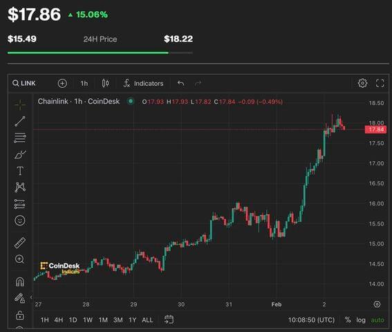 Analysts consider LINK as the safest bet to profit from the tokenization narrative. Chainlink's (LINK) surged to a 22-month high Friday, ending a three-month bull breather for the token of the leading decentralized oracle network. The world's 13th largest cryptocurrency peeped above $18 during European hours, the highest since April 3, 2022, registering a 15% gain on a 24-hour basis, according to CoinDesk data. The LINK price has risen nearly 30% in a week, beating major cryptocurrencies including bitcoin (BTC) and ether (ETH). The rally marks a bullish breakout from the three-month range that's seen it stuck between $13 and $17, and signals a continuation of a comeback from June 2023 lows near $5. Over the years, Chainlink has emerged as a critical component of the crypto industry infrastructure, connecting blockchains with data from the outside world through its oracles and a wide range of partnerships. Its blockchain-agnostic infrastructure ensures compatibility with different blockchains and facilitates the seamless and secure transfer of coins from one blockchain to another. "Traditional financial institutions need data, compute, and cross-chain capabilities to adopt blockchains and tokenized RWAs at scale. Only the Chainlink platform provides all three," Chainlink said on X early this week. Last month, analysts at K33 Research said LINK is the safest way to profit from the ever-strengthening tokenization of real-world assets (RWA) narrative. Tokenization allows assets like gold, stocks, and real estate to trade as digital tokens on a blockchain. According to Boston Consultancy Group, tokenized RWAs could be worth $16 trillion by 2030. Influx of new money The dollar value locked in the number of open futures contracts tied to LINK has more than doubled to a record $490 million, according to data source CoinGlass. In cryptocurrency terms, open interest has surged 62% to 27.51 million LINK. An increase in open interest represents an influx of new money into the market. A rise in price alongside an uptick in open interest is said to confirm the trend. Meanwhile, funding rates in perpetual futures contracts remain positive, but well below highs reached in December, a sign the market is not yet overheated on the bullish side. https://www.coindesk.com/markets/2024/02/02/chainlinks-link-token-taps-22-month-high-of-18-ending-three-month-breather/