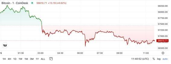 Bitcoin tumbled below the $56,000 level on Thursday before a modest bounce. Cryptocurrencies continued trending to the downside as recession fears weighed on risk assets ahead of Friday's key jobs data report. Bitcoin (BTC) declined more than 4% at one point Thursday before bouncing to $56,500 at press time, off 2.2% over the past 24 hours. Ethereum's ether (ETH) declined over 4% during the same period, trading below $2,400. The broad-basket CoinDesk 20 Index was down more than 3%, with dogecoin (DOGE), cardano (ADA) and litecoin (LTC) outperforming. Native token of layer-1 blockchain Aptos (APT) tumbled 7%, the largest loser among the CoinDesk 20 constituents, as an upcoming token unlock event weighed on its price. Some $65 million worth of locked tokens, 2.3% of the current supply, will be added to circulation next week including to early investor, per Token.Unlocks data. Cryptocurrencies usually underperformed the broader market in a window of seven days before and after large token unlocks over past years, a recent Messari research concluded analyzing hundreds of unlock events over the past years. Looking at traditional markets, key U.S. equities declined during the morning session in a broader risk-off sentiment. The Dow Jones Industrial Average (DJIA) was down 0.9%, while the broad-based S&P 500 lost 0.5% by 12:00 Eastern time. The tech-heavy Nasdaq 100 erased its opening gains and stood mostly flat. Crypto-focused stocks also performed poorly. Crypto exchange giant Coinbase (COIN) declined 1%, briefly slipping below $160 for the first time since February, taking out the lows hit during the early August crash due to the Japanese yen carry trade unwind. Large-cap bitcoin miners Marathon (MARA) and Riot Platforms (RIOT) were down 4% and 2%, respectively. https://www.coindesk.com/markets/2024/09/05/aptos-leads-losses-as-crypto-weakness-continues-coinbase-shares-fall-to-7-month-lows/