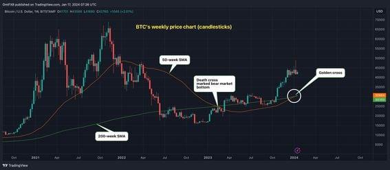 The 50-week simple moving average (SMA) of bitcoin's price has crossed above the 200-week SMA for the first time on record. Market enthusiasts call it a "golden cross," indicating a positive shift in asset prices, and now this marker has finally appeared on the bitcoin (BTC) weekly price chart. The 50-week simple moving average (SMA) on bitcoin has crossed over the 200-week SMA for the first time on record, confirming the golden cross. The phrase and its counterpart, "the death cross," in which the short-duration SMA dips below the long-duration SMA, originated in Japan, per some technical analysis textbooks. Many traders see crossovers as forward-looking indicators, with the golden version signaling a long-term bull market ahead. The bullish interpretation could be challenged because averages are based on past data and tends to lag prices. In other words, averages represent what happened in the past, and the first golden cross on the weekly chart results from bitcoin rallying over 70% to $42,700 in four months. Thus, seasoned traders consider crossovers as lagging indicators, often coinciding with trend exhaustion. For instance, the weekly death cross confirmed in early 2023 marked the bottom of the bear market. Bitcoin's daily chart golden and death crossovers have a mixed record of predicting bullish and bearish trends. Bitcoin's rally has already stalled, with the cryptocurrency trading 10% lower from highs near $49,000 registered after 11 spot exchange-traded funds (ETFs) began trading in the U.S. last Thursday. Per observers, the bullish momentum has waned due to early ETF flows failing to match the sky-high market expectations. "The Net flow of funds for the ETFs has been $965M (including seed funds), a strong start thus far. However, the spot price is down from the launch-driven euphoria as investors set unreasonably high launch expectations," Greg Cipolaro, global head of research at NYDIG, said in a newsletter Tuesday. https://www.coindesk.com/markets/2024/01/17/bitcoin-sees-its-first-ever-weekly-golden-cross/