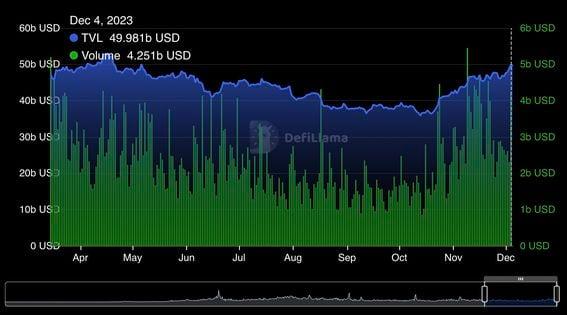 An uptick across Solana-based protocols coupled with more than $700 million in deposits to Blast has fueled growth of the value locked in decentralized finance. DeFi's TVL has gained more than $15 billion in six weeks. Rising asset prices coupled with fresh inflows have contributed to the increase. Value on some Solana-based protocols has risen by as much as 120% and newly announced layer-2 platform Blast received more than $700 million in deposits. The total amount of capital locked or staked across all decentralized finance (DeFi) protocols reached $50 billion on Tuesday for the first time in six months as the value of underlying assets surged and investors sought to secure a yield on their crypto holdings. Data from DefiLlama shows that since Oct. 13, when the sector was at multiyear lows, the figure has increased by $15 billion. The search for yield was illustrated last week, when Blast, a newly announced layer 2 project that hopes to go live next year, received more than $700 million in deposits from traders and investors who were unperturbed by the fact that assets cannot be withdrawn until at least March. Since Oct. 13, ether (ETH), the primary asset used across the DeFi market, has risen by 42%, outpacing the whole DeFi market, which increased by 41%. It's worth noting that a significant portion of DeFi protocols offer yields on stablecoins, which are pegged to traditional fiat currencies like the dollar, euro or sterling. Transactional volume has also risen: More than $5.4 billion changed hands on a single day last month, the most since March. The sector experienced a boost earlier this year as a result of Ethereum's shift to a proof-of-stake blockchain, which meant holders could stake ether to become a network validator and receive rewards. The transition spurred the liquid staking market, led by the likes of Lido and RocketPool, which combined are responsible for 45% of DeFi's total value locked (TVL). Lido currently offers an annual yield of 3.7% whilst RocketPool offers 3.92%. Liquid staking is a form of derivative that allows investors to generate a yield from staking ether whilst receiving a token that can be used elsewhere across the DeFi ecosystem. TVL on Solana-based protocols marginfi, Jito and Marinade Finance has jumped by between 60% and 120% in the past 30 days as institutional interest around Solana continues to mount. Grayscale's Solana Trust traded at an 869% premium last month, demonstrating significant demand from the institutional market. Jito, Solana's liquid staking protocol, offers stakers a yield of 6.96%, a level that led to $327 million in inflows since Oct. 13. https://www.coindesk.com/business/2023/12/05/defi-market-rebounds-to-50b-as-speculators-hunt-for-yield/