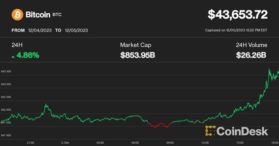 The sharp move higher from $42,000 Tuesday prompted $73 million in liquidations, mostly from leveraged positions betting on lower prices. A quick surge in bitcoin (BTC) early Tuesday afternoon lifted the price above $44,000 on some crypto exchanges, including Coinbase, for the first time since early April 2022 as the largest crypto extended its rally supported by declining interest rates and anticipation for a spot bitcoin exchange-traded fund in the U.S. The CoinDesk Bitcoin Index XBX, which gathers pricing data from multiple exchanges, rose from below $42,000 earlier in the day to hit a session high of $43,868. It's shed some of the gains since, retreating to around $43,500, still up nearly 5% over the past 24 hours. The volatile action liquidated $73 million of leveraged bitcoin derivatives trading positions, predominantly shorts betting on lower prices, Glassnode data shows. The bitcoin rally is supported by a confluence of growing institutional investor interest and anticipation of an imminent regulatory approval for listing spot-based BTC ETFs in the U.S., simplifying access to the asset for traditional players, Joel Kruger, market strategist at LMAX Group, said in an email. Kruger said BTC's upward price momentum has a clear path ahead until the area between $48,000 and $53,000, based on technical price levels – notably highs hit in March 2022 and September 2021. "There is a nice zone between those two levels with very little in the way of any meaningful resistance between the current price and that March 2022 high," Kruger explained. https://www.coindesk.com/markets/2023/12/05/bitcoin-blasts-to-44k-on-coinbase-and-could-run-towards-48k-resistance-lmax-analyst/