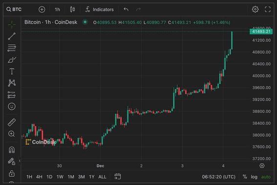 Bitcoin is trading at levels not seen since April 2022, shrugging off a tough year marked by several implosions and regulatory clampdowns. Shares of Coinbase (COIN) and MicroStrategy (MSTR) both jumped more than 4% Monday as bitcoin (BTC) extended its year-to-date gain to over 150%, at one point touching $42,000. Traders consider the two companies as proxy bets for the crypto markets, given their close ties to the largest cryptocurrency by market cap, which has added 4% in the past 24 hours. Coinbase is one of the largest crypto bourses by trading volumes and is among the few publicly listed crypto companies in the U.S. The firm, which has historically maintained a regulated stance, is listed as a custodian for several proposed bitcoin spot exchange-traded fund (ETF) products in the country. The crypto exchange’s Nasdaq-listed shares had added 4.34% to $139.45 as of 11 a.m. ET (16:00 UTC), their highest level since April 2022. Business software company MicroStrategy is the largest public holder of bitcoin, with 174,000 BTC, a position it acquired over three years by investing company funds and proceeds from bond sales. The value of the holdings is now equal to over 88% of MicroStrategy’s $8.2 billion stock market capitalization. MSTR traded at $554.17, up around 5%, also a level last seen in April 2022. Bitcoin has surged recently amid optimism U.S. regulators will approve exchange-traded funds (ETFs) that hold BTC, a move some experts believe will prompt a flood of investment into the foremost cryptocurrency. Crypto miner Marathon Digital (MARA) gained 5% and rival Riot Platofrms (RIOT) 6.7%. Hut 8 (HUT), which completed its merger with U.S. Data Mining Group on Friday, jumped 380%. However, this astronomical jump can be attributed to a stock consolidation due to the merger. Taking the 5:1 ratio into account, the shares are down some 11%. https://www.coindesk.com/markets/2023/12/04/coinbase-microstrategy-jump-in-premarket-trading-as-bitcoin-rallies/