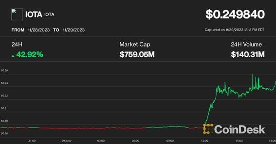 The IOTA Ecosystem DLT Foundation claims to be the first foundation to be registered under the emirate's regulatory framework for blockchain foundations, the press release said. The IOTA token jumped 43% after registering an ecosystem development foundation in Abu Dhabi. The IOTA Ecosystem DLT Foundation will be funded by $100 million worth of tokens vested for four years. Native token of the IOTA ecosystem (IOTA) jumped 43% Wednesday on news about registering a development foundation in Abu Dhabi, the capital of United Arab Emirates. The IOTA Ecosystem DLT Foundation claims to be the "first" foundation being registered under the regulatory framework called the DLT Foundations Regulations, set up by the city's financial watchdog Abu Dhabi Global Market (ADGM), according to an IOTA press release. The new organization will be funded by $100 million worth of IOTA tokens, locked up for four years, the press release added. The cryptocurrency's price surged to 25 cents from 17 cents immediately after the announcement, hitting its highest level since February. The development came after IOTA unveiled plans in September to establish a regulated entity in Abu Dhabi to foster the network's global expansion. Iota is one of several crypto-adjacent firms that clinched approvals from Abu Dhabi's regulators recently. Paxos also received a go-ahead to operate in the Emirati city Wednesday. Liminal, a digital asset custody and wallet infrastructure provider also secured an in-principle approval from ADGM earlier this month. The rash of approvals comes as Abu Dhabi amps up its efforts to establish itself as a crypto-friendly hub. Earlier this year, the emirate announced it would pour roughly $2 billion into web-3 and blockchain startups to attract builders to its economic free zone. "Working with companies like IOTA, ADGM aims to move towards a future characterized by setting global benchmarks in the ever-evolving blockchain and Web3 landscape," Hamad Sayah Al Mazrouei, CEO of the Registration Authority of ADGM, said in a statement. https://www.coindesk.com/markets/2023/11/29/iota-jumps-43-after-registering-ecosystem-foundation-in-abu-dhabi/