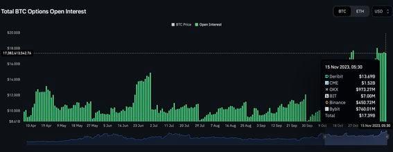 The notional open interest in BTC options worldwide stood at $17.5 billion at press time, while open interest in the futures market was $15.84 billion. The bitcoin options market is now bigger than the BTC futures market in terms of notional open interest. The flipping is a sign of market maturity and the influx of sophisticated traders in the market. The crypto market has come back to life this year, with bitcoin (BTC) doubling in value, supposedly on the back of haven demand, spot ETF excitement in the U.S. and dovish Federal Reserve expectations. While most activity was initially concentrated in bitcoin's spot and futures markets, options tied to the cryptocurrency, which offer a cheap way to bet on a price rise or drop, have become more prominent. In terms of open interest (OI), the BTC options market is now bigger than the futures market. At press time, the U.S. dollar value locked in active options contracts stood at $17.39 billion, almost 10% more than futures' open interest of $15.84 billion, according to data source CoinGlass. Increased activity in the options market is a sign of market sophistication, according to Luuk Strijers, chief commercial officer of leading crypto options exchange Deribit. "The surpassing of BTC options open interest over futures OI is a clear sign of the market maturing," Strijers told CoinDesk. "This shift indicates a growing preference for options as tools for strategic positioning, hedging, or access to the recent rise of implied volatility, reflecting the market's evolving sophistication." A bigger options market also means traders need to consider the impact of quarterly and monthly settlements and market makers' hedging activities on spot prices. Options are derivative contracts that give the purchaser the right, but not the obligation, to buy or sell the underlying asset at a predetermined price on or before a specific date. A call option gives the right to buy, while a put confers the right to sell. Traditionally, options are used to mitigate risk, although some speculators use them like futures to amplify returns. Bulls typically buy puts to protect against a potential downside, while bears use call options to protect from a sudden upswing in prices. Efficient use of options is contingent on a thorough understanding of key metrics, the so-called Greeks – delta, gamma, theta and rho, that affect the price of an options contract. One possible reason for options' growing popularity is that they allow traders to not only hedge against and profit from the bitcoin price, but also other factors such as volatility or the degree of price turbulence and time. Writing or selling options to profit from a market lull and collect an additional yield on top of the spot market holdings were popular strategies earlier this year. More recently, traders have bought options to benefit from the renewed volatility explosion. Volatility has a positive impact on options' prices. Unlike options, spot and futures markets are one-dimensional, allowing speculation only on the direction of the price. Futures contracts commit a buyer to pay for and a seller to deliver a particular asset at a future date. Futures are generally considered more risky than options, involving greater leverage and allowing traders to control assets of much greater value. That exposes futures traders to outsized losses that exceed the value of their initial deposit and to forced liquidations by exchanges. https://www.coindesk.com/markets/2023/11/15/bitcoins-options-market-has-overtaken-its-futures-market/