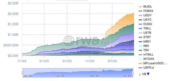 BlackRock's BUIDL has quickly topped $500 million in market cap. Tokenized Treasury notes passed $2 billion in market cap after rapid growth from Blackrock's BUIDL and other issuers. This comes only five months after the funds hit the $1 billion milestone in March. Less than five months after hitting $1 billion in market capitalization, tokenized Treasury notes have doubled in size again, crossing the $2 billion level on Saturday, according to data from RWA.xyz. Tokenized Treasuries are digital representations of U.S. government bonds that can be traded as tokens on blockchains such as Ethereum, Stellar, Solana, Mantle and others. While $2 billion is an impressive milestone for the recently launched funds, there is far more potential given the Treasury market's massive size of $27 trillion. The largest one, BlackRock’s USD Institutional Digital Liquidity Fund (BUIDL), is a big factor in this year's soaring market cap. ust six weeks after its late March launch, BUIDL became the largest tokenized Treasury fund at $375 million in market cap. Assets now stand at $503 million. Competitors include Franklin Templeton’s OnChain U.S. Government Money Fund (FOBXX) and Ondo’s U.S. Dollar Yield (USDY), both of which have also seen explosive growth. Most of the recent growth, however, came from smaller issuers, rwa.xyz data shows. Hashnote's offering mushroomed nearly 50% to hit $218 million over the past month. Meanwhile, OpenEden's and Superstate's products grew 37% and 18%, respectively, during the same period, both nearing $100 million market cap. Tokenized Treasury funds have become a popular investment vehicle for crypto traders looking to diversify their holdings and take advantage of the rapid rise in Treasury yields over the past few years while also being able to settle transactions at any time. The 10 year U.S. yield currently stands at 3.81% versus 1.5% four years ago. Similarly, the 2 year yield has risen to 3.92% up from near zero levels in 2020 and 2021. https://www.coindesk.com/markets/2024/08/26/tokenized-treasury-funds-pass-2b-market-cap-amid-blackrocks-explosive-growth/