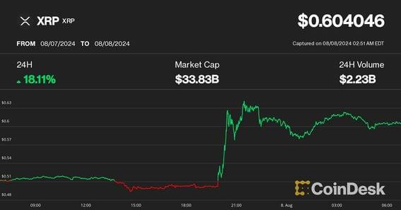 Trading volumes nearly tripled and open interest on XRP-tracked futures jumped $200 million in the past 24 hours. XRP surged 17% after a court ruling in the case involving Ripple Labs and the U.S. Securities and Exchange Commission (SEC). This led to a jump in its price from 50 cents to 65 cents and a significant increase in trading volumes. The judge ordered Ripple to pay $125 million in civil penalties and agreed to an injunction against future securities law violations, although an appeal by the SEC is expected, potentially extending the legal proceedings. XRP surged 17% to lead market-wide gains after a U.S. judge made a milestone ruling in the long-running case between the closely related Ripples Labs and the U.S. Securities and Exchange Commission (SEC). Crypto traders widely expected a settlement in the case throughout July, with the tokens drawing outsized attention from South Korean markets and beating gains in major tokens on several days, as reported. On Wednesday, a federal judge ordered Ripple to pay $125 million in civil penalties and imposed an injunction against future securities law violations. Although the case is said to have reached its end, SEC is expected to appeal the ruling – likely extending legal matters. Markets positively reacted to the ruling as prices of XRP zoomed to 65 cents from 50 cents after the ruling, with trading volumes jumping to $4.2 billion in the past 24 hours from Tuesday’s $1.2 billion. As such, there were just $6 million in short liquidations on XRP-tracked futures, suggesting the movements were spot driven. Meanwhile, open interest—or the number of unsettled futures contracts—on XRP-tracked futures rose by $200 million in the wake of the ruling, indicative of new money entering the market. Data shows that over 60% of these traders have a long bias and expect prices to increase further. XRP was one of the few major tokens in the green during the Asian morning trading hours amid a flat market. Meanwhile, Toncoin (TON) jumped nearly 6% to $6.33 after Binance announced it will list TON on its marketplace. Bitcoin (BTC), Solana’s SOL and BNB Chain’s BNB were unchanged in the past 24 hours, data shows, while ether (ETH) dropped 3.4%. The broad-based CoinDesk 20 (CD20), a liquid index tracking the largest tokens, minus stablecoins, is up 0.3%. Inflow into bitcoin exchange-traded funds (ETFs) came in at $45.1 million for the August 7 trading day, according to market data. GBTC saw outflow of $30.6 million, while BTCW had inflow of $10.5 million and IBIT had $52.5 million. Ether ETFs, saw outflows of $23.7 million. Grayscale's ETHE hit $31.9 million in outflow, while Fidelity's FETH had $4.7 million in inflow, ETH saw $1.7 million in inflow, and EZET had $1.8 million of the same. The rest registered no flow. BTC's lack of movement might be the market beginning to price in a potential Kamala Harris White House, with Semir Gabeljic, Director of Capital Formation at Pythagoras Investments pointing to Harris' rise as a market catalyst to watch. Harris, who recently tied Donald Trump both in the polls and on Polymarket (the latter of which has historically favored Trump), now has a pro-crypto advocacy group called "Crypto for Harris" attached to her name which hopes to make smart crypto legislation a bi-partisan issue. Many stakeholders, including Coinbase's Chief Legal Officer Paul Grewal, are also calling for crypto policy not to be the domain of one party so that the U.S can play catch-up to Asia in rule-making. Meanwhile, other coins that are in the green during the Asia trading day are TONCoin, up 9.7%. TON may have some momentum as the TON-themed 'The Open Summit', part of ABS 2024 in Taipei, wraps up Thursday. At the same time, Trump-themed PoliFi coins are struggling as their namesake is challenged in what's now a very competitive election. MAGA (TRUMP) is down 12.5%, or 44.5% on-month, while Solana's TREMP is down 6% on-day and 43% on-month. Harris-themed KAMA is trading flat, and up over 160% in the last month. CORRECTION (August 8, 12:15 UTC): Corrects the lede to clarify that the judge made a ruling in the Ripple-SEC case. https://www.coindesk.com/markets/2024/08/08/xrp-jumps-17-beating-bitcoin-gains-as-ripple-sec-case-ends/