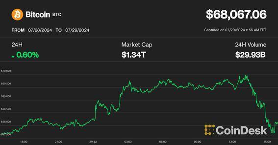 The price of bitcoin still appears poised to close out July with sizable gains after plunging below $54,000 earlier in the month. In what's become a familiar pattern over the past few months, a rally in bitcoin (BTC) to a key level was met with a wave of selling as the price during Monday morning U.S. hours quickly plunged more than 3% after pushing above $70,000 for the first time since early June. At press time, bitcoin was changing hands at $67,800, roughly flat over the past 24 hours. The broader CoinDesk 20 Index was higher by 1.1% over the same time frame, helped along by sizable gains for bitcoin cash (BCH), litecoin {LTC}} and solana (SOL). Traders will be familiar with this price pattern in 2024, which first manifested itself in mid-January when bitcoin climbed to a multi-year high of $47,000 just after the spot ETFs opened for trade. That move higher was reversed within minutes and bitcoin days later had tumbled below $40,000 before the uptrend began anew. Similar price action was seen in early March after bitcoin pushed to a what was then a new all-time high above $69,000 and just hours later found itself below $60,000. Later that month, a move to another record above $73,500 was snuffed out in quick fashion and more than four months later that level hasn't again been challenged. While the above might be frustrating to leveraged traders and their profit and loss, technicians might note a pattern as each of those examples shows higher highs and higher lows – the sort of "up and to the right" chart that bulls like to see. Indeed, earlier in July, bitcoin plunged below $54,000 as a German government entity began unloading its stash of 50,000 tokens seized as part of a criminal case. Yet just a couple of days before August hits, bitcoin is poised to close the month with a sizable gain from the $63,000 area in which it begun. https://www.coindesk.com/markets/2024/07/29/bitcoin-pulls-back-sharply-after-touching-70k/