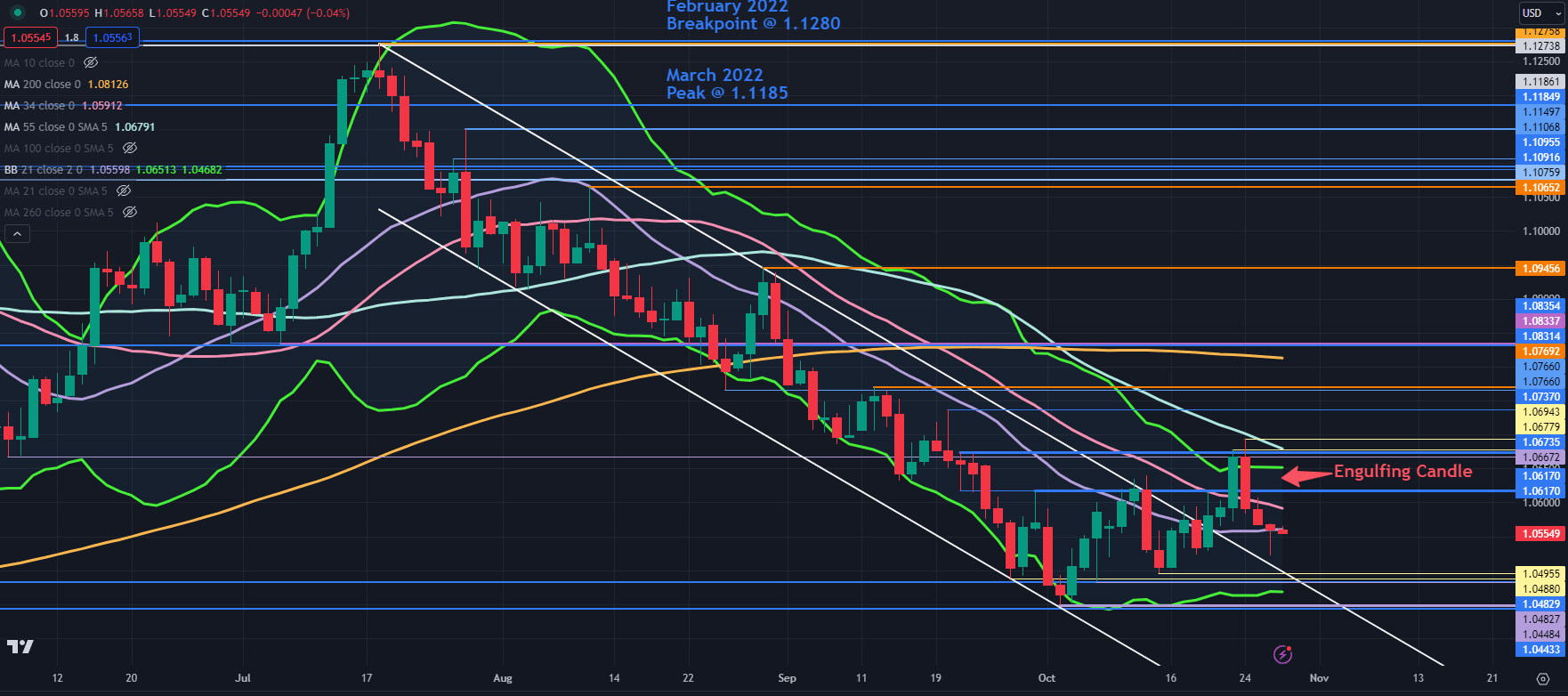 Euro, EUR/USD, US Dollar, Trend Breakout, Candlestick, Bollinger Band - Talking Points Euro bulls were rewarded earlier this week before a pullback surfaced The technical set-up from the recent rally might see Euro bears re-enter the fray The squeeze higher appears to have been rejected for now. Will EUR/USD go lower? EUR/USD TECHNICAL ANALYSIS EUR/USD cleanly broke through the topside of a descending trend channel last week and continued higher to briefly pierce minor resistance levels near 1.0680 to make a high at 1.0695. The price action on the day that the price made that high saw a Bearish Engulfing Candlestick formation emerged and it has gone lower in the proceeding days. A Bearish Engulfing Candlestick opens at, or above the previous candle’s close. The length of the bearish candle ‘engulfs’ the previous green candle and it then closes below the prior candle’s open. This reversal might signal that the descending trend may re-emerge. The recent rally broke above the upper band of the 21-day simple moving average (SMA) based Bollinger Band. On the same day that Engulfing Candlestick materialised, the price closed back inside the band. This potentially adds weight to the perspective that a reversal could be in play. A bearish triple moving average (TMA) formation requires the price to be below the short-term SMA, the latter to be below the medium-term SMA and the medium-term SMA to be below the long-term SMA. All SMAs also need to have a negative gradient. When looking at any combination of the 21-, 34-, 55- and 100-day SMAs, the criteria for a TMA have been met and might suggest that bearish momentum is evolving. To learn more about trend trading, click through on the banner just below. On the downside, nearby support might lie near the previous lows and breakpoints in the 1.0480 – 1.0495 area ahead of the lows seen in December 2022 and October 2023 near 1.0445. On the topside, the 55-day SMA is currently near the recent peak and there might be a resistance zone ahead of 1.0700. The next resistance levels could be at the breakpoints and previous highs near 1.0740, 1.0770, 1.0835 and 1.0945 ahead of a cluster zone of potential resistance in the 1.1075 – 1.1100 area. EUR/USD DAILY CHART Chart Created in TradingView https://www.dailyfx.com/analysis/euro-technical-outlook-trend-break-might-be-short-lived-for-eur-usd-20231027.html