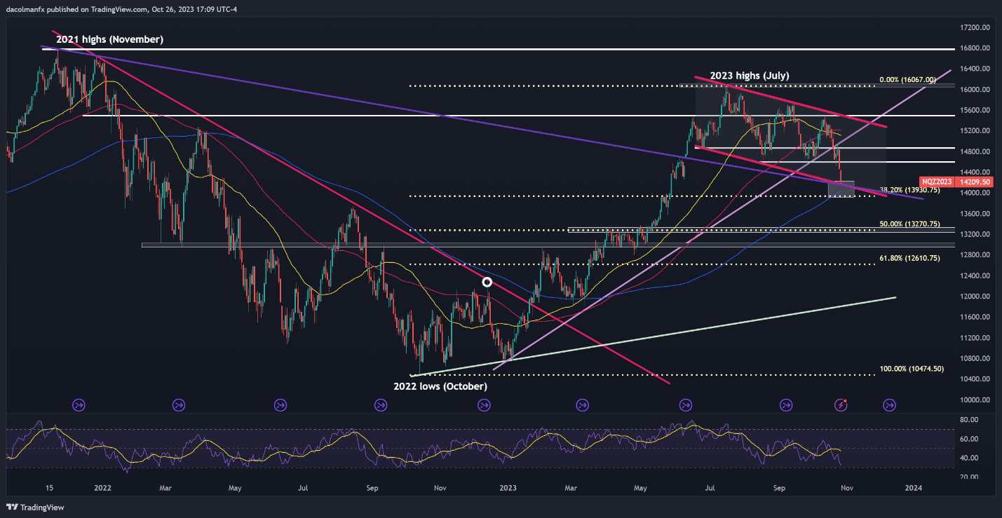 NASDAQ 100 OUTLOOK: Nasdaq 100 breaks down, falling to its lowest level since late May after breaching a key floor For sentiment to improve, cluster support in the 14,150/13,930 range must hold at all costs This article analyzes the key technical levels worth watching on the NDX in the coming days. Most Read: British Pound Outlook: GBP/USD Bounded by Fibonacci Support & Trendline Resistance The Nasdaq 100 broke down after breaching technical support located in the 14,600 area. This bearish development intensified the decline, pushing the technology index to its lowest level since late May and into correction territory, characterized by a pullback of more than 10% but less than 20% from its recent high. Mixed earnings from heavy hitters, such as Alphabet and Meta, coupled with elevated U.S. Treasury yields across the curve, have contributed to the prevailing atmosphere of pessimism, creating an unfavorable environment for risk assets. Positive economic data hasn't succeeded in boosting the mood. While activity remains extremely resilient today, investors are forward-looking and deem that the economy won’t be able to sustain its performance for much longer, especially with the Fed hell-bent on keeping rates high for an extended period as part of its fight against inflation. Taking a look at price action, the Nasdaq 100 has fallen towards an area of cluster support that extends from 14,150 to 13,930, where the lower boundary of the short-term descending channel aligns with the 200-day simple moving average and the 38.2% Fibonacci retracement of the Oct 2022/Jul 2023 rally. For sentiment to improve, it is imperative for confluence support in the 14,150/13,930 range to hold firm. Any failure to maintain this critical zone could trigger a large selloff, potentially taking the equity benchmark towards 13,270, which coincides with the 50% retracement of the move discussed above. In the event that dip buyers return and spark a bullish turnaround, initial resistance lies at 14,600. Upside clearance of this key ceiling could reignite upside momentum and set the stage for a move higher to 14,860. On further strength, the market focus will transition to 15,100. NASDAQ 100 TECHNICAL CHART Nasdaq 100 Futures Chart Created Using TradingView https://www.dailyfx.com/news/ndx-nasdaq-100-forecast-cluster-support-in-play-after-breakdown-more-pain-ahead-20231026.html