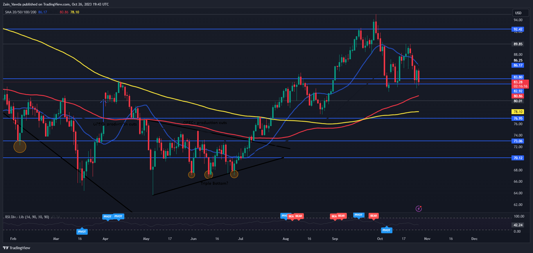 OIL PRICE FORECAST: Oil Slips on Demand Fears as US Exports and Imports are on a Steady Decline. Middle East Tensions Ease but Geopolitical Risk Remains and Will Keep Markets on Edge Moving Forward. IG Client Sentiment Shows Traders are 76% Net-Long on WTI at Present. To Learn More About Price Action, Chart Patterns and Moving Averages, Check out the DailyFX Education Section. Most Read: What is OPEC and What is Their Role in Global Markets? Oil prices have fallen today on resurgent demand fears which for now appear to be overshadowing the tensions in the Middle East. There appears to be growing belief that the US may be able to avert a full-scale military operation on the ground in Gaza which seems to have allayed fears of further escalation, even if it may prove temporary. At the moment this continued shift in sentiment is making it hard to predict future movements from a technical standpoint. US OIL IMORTS AND EXPORTS ON A STEADY DECLINE A report today looking into flows data and analysis of Oil revealed that US have seen waterborne imports of Crude Oil from OPEC+ members decline steadily over the past 12 months. Total US Crude imports for October 2023 are set to average 2.47 million barrels down from the 2.92 million barrels a day in September. Analysts have attributed a part of the fall to the end of the summer period in the US which tends to see a decline in demand but the other factors are a bit more concerning. There is a belief that the drop in barrels from Saudi Arabia are a sign that the Kingdom is looking to have a greater influence on Oil prices. All of this comes at a time when the US SPR is at multi decade lows with the US last week announcing its intention to replenish the reserves heading into the end of 2023. Looking at the export numbers from the US and it tells a similar story of a slowdown with the US exporting less Oil to Europe. Crude exports to Europe fell to 1.86 million barrels a day in September, down from the 2.01 million barrels a day in July. The drop doesn’t appear to have been influenced by the reason US-Venezuela deal as a spike in supply is yet to materialize. This was expected and discussed in my previous articles, Venezuela needs significant investment into its Oil infrastructure before any meaningful supply will return to markets. US GDP data and durable goods orders were released today pointing to a strong economy but Q4 may prove more challenging and could be adding to the uncertainty and lack of commitment from Market Participants. This coupled with the uncertainties in the Middle East at the moment is likely to see a lot of choppy price action in the days ahead. Next week brings the US FOMC meeting and other high impact data events which could stoke volatility. As one analyst put it “We are one headline away from a big rally in the market”, and it is likely that concern that is currently keeping both bulls and bears from committing to a directional bias at this stage. TECHNICAL OUTLOOK AND FINAL THOUGHTS From a technical perspective WTI enjoyed a bounce off support yesterday with a hammer candle close off support hinting at further upside. Today however, we have remained rangebound, struggling to take out the high or low from yesterday. A sign of the cautious approach we are seeing in many asset classes today as we approach the weekend and next week's Central Bank meetings. A daily candle close below the 83.00 mark can finally open up a possible return to the 80.00 psychological level. There are some hurdles however with the 100-day MA resting at the 80.86 while he previous swing low at 81.50 may provide a challenge as well. I know this may make me sound like a broken record given the amount of times this has been mentioned in the past two weeks, but the Geopolitical developments remain a risk. Any signs of escalation could renew buying pressure as mentioned above, we are one headline away from a potential rally in Oil prices. WTI Crude Oil Daily Chart – October 26, 2023 Source: TradingView Key Levels to Keep an Eye On: Support levels: 81.50 80.86 80.00 Resistance levels: 83.80 85.00 86.16 Brent Crude is a mirror image of the WTI chart at the moment. At the moment we have seen a death cross pattern develop yesterday which hints at downside ahead. An upside continuation will likely hinge on the Geopolitical developments as markets continue to fear a global slowdown in demand for Oil in Q4. Intraday Levels to Keep an Eye On: Support levels: 85.83 84.78 84.28 Resistance levels: 89.00 90.00 92.00 Brent Oil Daily Chart – October 26, 2023 Source: TradingView IG CLIENT SENTIMENT IG Client Sentiment data tells us that 76% of Traders are currently holding long positions. Given the contrarian view adopted at DailyFX, is Oil destined for a return to the psychological 80.00 mark? https://www.dailyfx.com/news/oil-price-forecast-wti-rangebound-as-demand-concerns-resurface-80-a-barrel-incoming-20231026.html