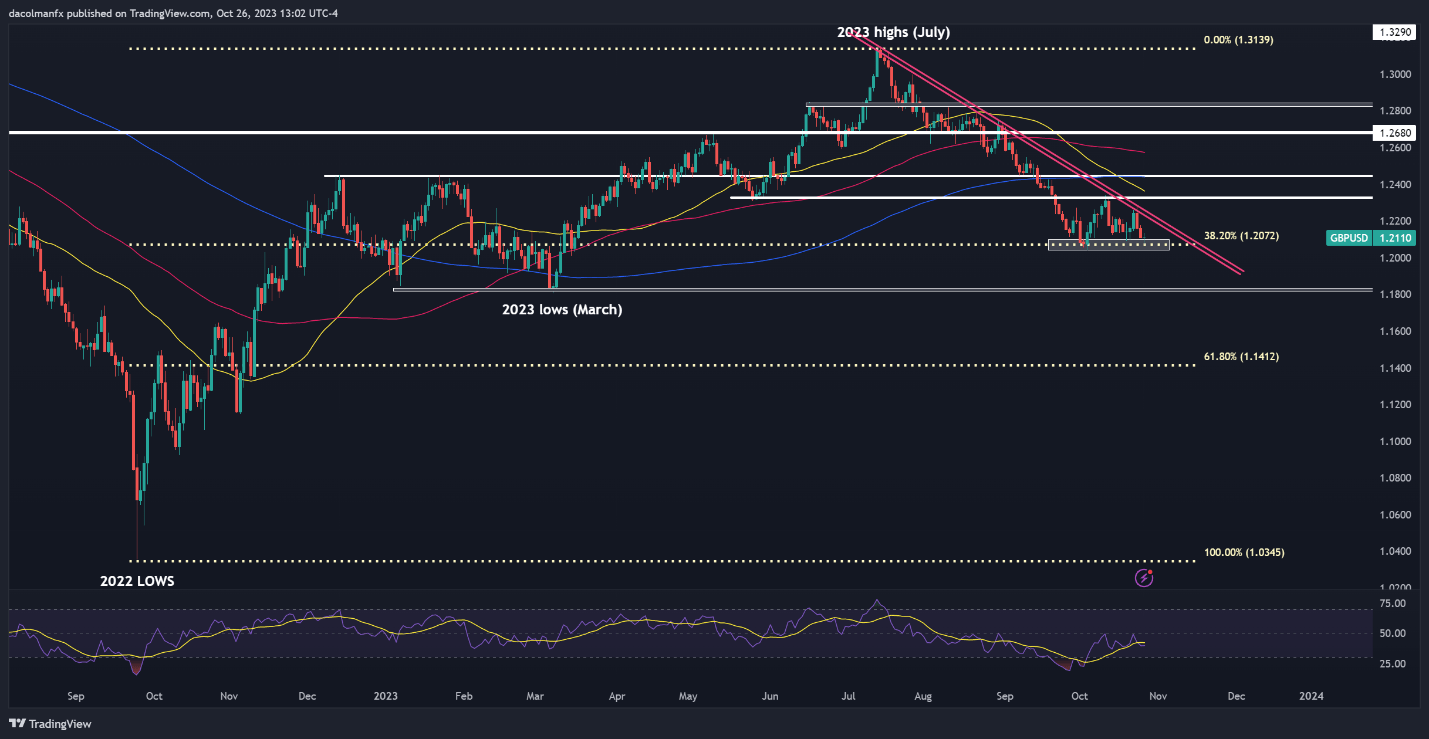 GBP/USD OUTLOOK: GBP/USD has been trending lower over the past three months or so After recent price action, cable appears compressed between trendline resistance and Fibonacci support This article presents important technical levels worth watching in the coming days Most Read: US Dollar Forecast - EUR/USD, AUD/USD on Shaky Ground. What Now? The British pound has been losing ground against the U.S. dollar since mid-July, with GBP/USD following a well-defined downtrend line and establishing impeccable higher lows and lower lows along its bearish trajectory, as shown on the daily chart below. Earlier in the week, cable made a push towards trendline resistance at 1.2275, but was swiftly rebuffed, reversing its course to the downside. This pullback suggests that sellers still have the upper hand in the market, as the greenback continues to ride a wave of bullish momentum in the broader FX space given elevated U.S. bond yields. Following its recent setback, GBP/USD is sitting above a critical support area near 1.2075, where the 38.2% Fibonacci retracement of the 2022/2023 rally aligns with several swing lows. It is imperative that this floor holds at all costs - any failure to do so may catalyze a slump towards the 1.1800 handle. In the event that prices bottom out and then start to rebound off current levels, dynamic resistance looms at 1.2225. Successfully piloting above this technical barrier could rekindle upward impetus, creating the right conditions for a move toward 1.2330. On further strength, the focus shifts to 1.2450, near the 200-day simple moving average. Curious to learn how retail positioning can shape the short-term trajectory of GBP/USD? Our sentiment guide has all the relevant information you need. Grab a free copy now! GBP/USD TECHNICAL CHART GBP/USD Chart Prepared Using TradingView For a complete overview of the British pound's technical and fundamental outlook in the coming months, make sure to grab your complimentary Q4 trading forecast now! https://www.dailyfx.com/news/forex-british-pound-forecast-gbp-usd-bounded-by-fib-support-trendline-resistance-20231026.html