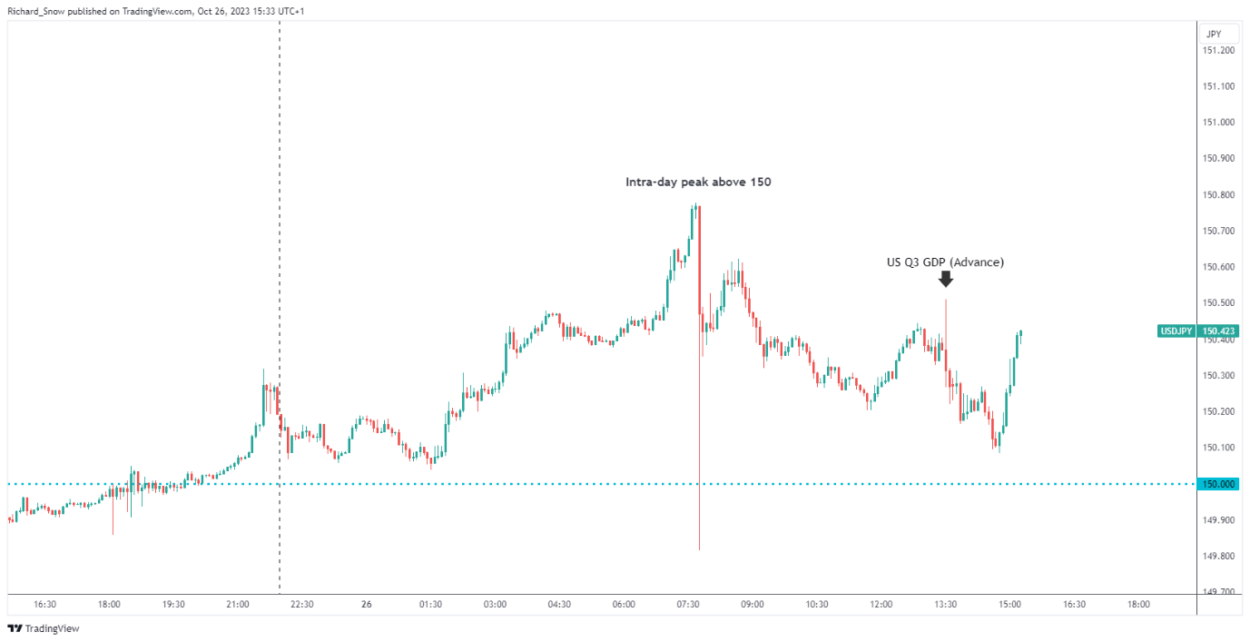 Japanese Yen (USD/JPY) Analysis USD/JPY goads Japanese officials after latest move above 150 Japanese government bond yields rise, prompting more buying from the BoJ US PCE data tomorrow and the Bank of Japan meeting concludes on Tuesday The analysis in this article makes use of chart patterns and key support and resistance levels. For more information visit our comprehensive education library USD/JPY Goads Japanese Officials after Latest Move Above 150 USD/JPY price action has been frustrating to watch as it essentially flatlined before the latest move into what many consider to be the threshold for FX intervention – the 150 level. The pair was trading around 150.50 before witnessing moderate selling pressure to bring it back below 150, only to return immediately. USD/JPY 5-Minute Chart Source: TradingView, prepared by Richard Snow The pair has, for the most part, heeded consistent warnings about undesirable moves that do not accurately reflect fundamentals. However, a recent run of better-than-expected US data and rising yields have pushed the dollar higher. The Bank of Japan has also stated it will not rush to change its accommodative monetary policy stance until the data suggests that inflationary pressures are being driven by demand side factors and not supply side effects. Therefore, with no anticipated movement on the interest rate front and no clear indication of adjustments to the yield curve, the yen exhibits few bullish drivers. The 50 simple moving average (SMA) has underpinned price action and can be seen as a dynamic level of support however, in the event officials intervene in the FX market they would be looking for a sizeable response – potentially seeing the pair trade below 146.50 and 145.00. Keep an eye out for a possible strengthening of language used by officials with more urgency. USD/JPY Daily Chart Source: TradingView, prepared by Richard Snow Japanese Government Yields Push Towards the 1% Marker Following in the footsteps of the US, Japanese government bond yields have been steadily rising, forcing the BoJ to step in and purchase bonds to keep government borrowing costs from spiraling. In a recent Reuters poll as many as two thirds of respondents anticipate the Bank of Japan will withdraw from negative interest rates in 2024. The BoJ Governor himself has said that the bank will have enough data by the end of 2023 to determine if a policy U-turn is needed. Therefore, expectations for next week’s meeting is for no change in rates but another tweak to the yield curve control policy can not be dismissed. 10-Year Japanese Government Bond Yield Source: TradingView, prepared by Richard Snow https://www.dailyfx.com/news/fx-intervention-watch-usd-jpy-breaches-150-ahead-of-us-pce-20231026.html