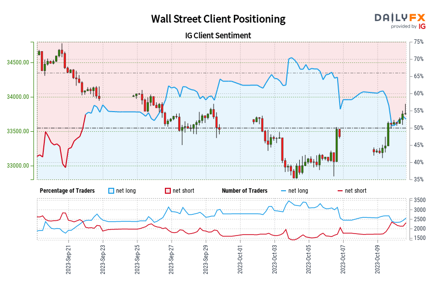 NUMBER OF TRADERS NET-SHORT HAS INCREASED BY 31.75% FROM LAST WEEK. Wall Street: Retail trader data shows 48.45% of traders are net-long with the ratio of traders short to long at 1.06 to 1. In fact, traders have remained net-short since Sep 21 when Wall Street traded near 34,068.90, price has moved 0.93% lower since then. The number of traders net-long is 9.95% lower than yesterday and 32.88% lower from last week, while the number of traders net-short is 13.96% higher than yesterday and 31.75% higher from last week. We typically take a contrarian view to crowd sentiment, and the fact traders are net-short suggests Wall Street prices may continue to rise. Our data shows traders are now net-short Wall Street for the first time since Sep 21, 2023 when Wall Street traded near 34,068.90. Traders are further net-short than yesterday and last week, and the combination of current sentiment and recent changes gives us a stronger Wall Street-bullish contrarian trading bias. https://www.dailyfx.com/analysis/WALL-IG-Client-Sentiment-202310101823.html