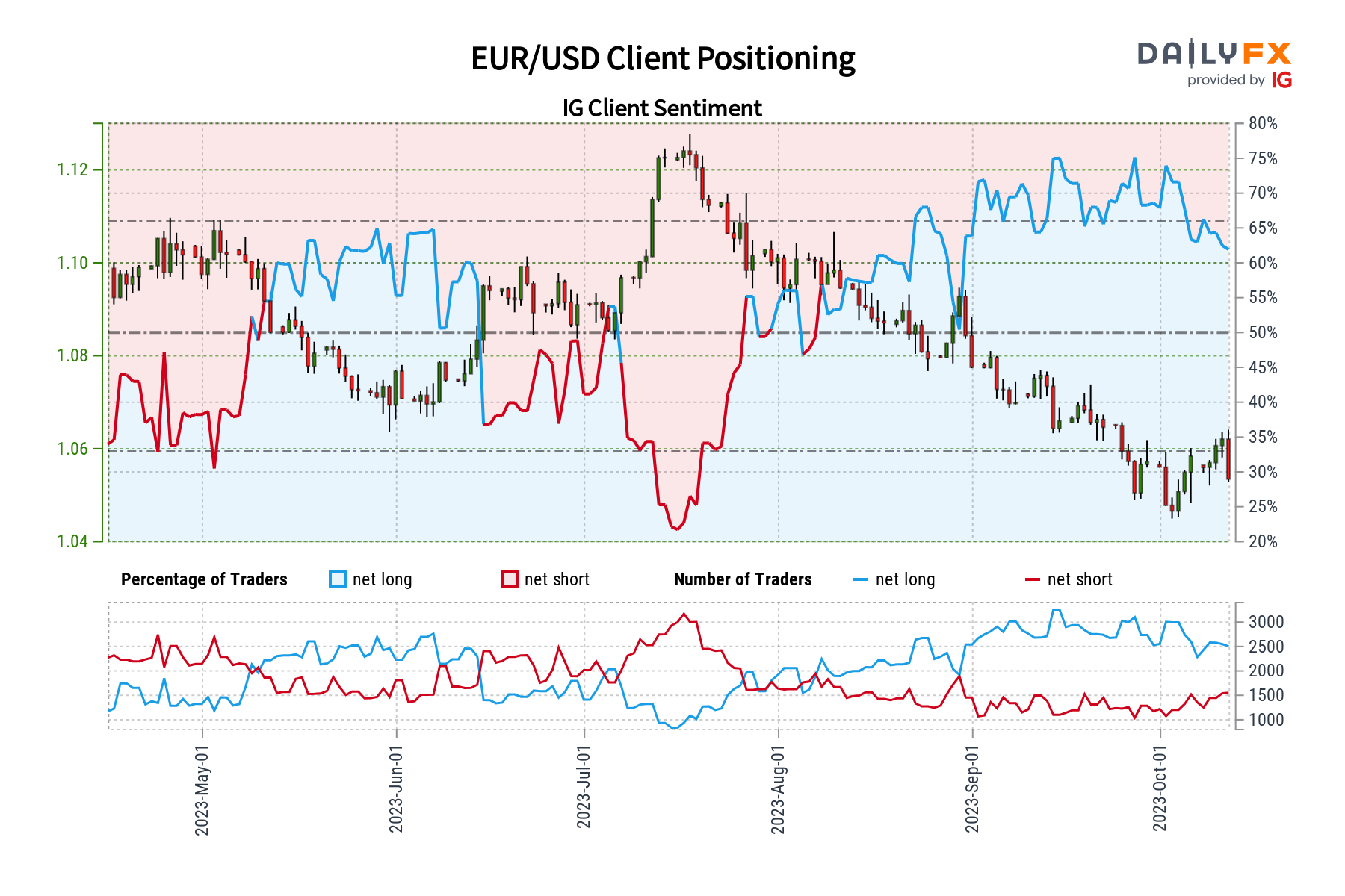 EURO, EUR/USD, TECHNICAL ANALYSIS, RETAIL TRADER POSITIONING – IGCS UPDATE Euro plunges most since early October on US CPI data In response, retail traders boosted upside EUR/USD bets Prices also rejected the key falling trendline from July The Euro plunged over 0.8 percent against the US Dollar on Thursday after a higher-than-expected US CPI report boosted Treasury yields. That was the worst single-day drop since early October. EUR/USD’s drop pushed retail traders to boost upside exposure, which can be seen by taking a look at IG Client Sentiment (IGCS). The latter tends to function as a contrarian indicator. With that in mind, will the Euro continue lower from here? EUR/USD Sentiment Outlook – Bearish The IGCS gauge shows that about 69% of retail traders are net-long EUR/USD. Since most of them remain biased higher, this continues to hint that prices may fall down the road. This is as upside bets increased by 10.46% and 5.62% compared to yesterday and last week, respectively. With that in mind, the combination of overall exposure and recent changes offers a stronger bearish contrarian outlook. Euro Daily Chart Focusing on the daily chart below, EUR/USD has turned lower following a rejection of the falling trendline from July. This has reinstated the broader downside focus following cautious gains since the beginning of this month. Now, immediate support is the March low of 1.0516. Below that is the 100% Fibonacci extension level of 1.0436. Breaking lower opens the door to extending the broader downtrend, exposing the 123.6% Fibonacci extension level of 1.0315. On the other hand, a turn higher and push above the falling trendline would open the door to an increasingly bullish outlook. That exposes the 61.8% level of 1.0631. Chart Created in Trading View https://www.dailyfx.com/analysis/euro-plunges-after-us-cpi-data-leaving-eur-usd-at-risk-amid-more-bullish-retail-bets-20231012.html