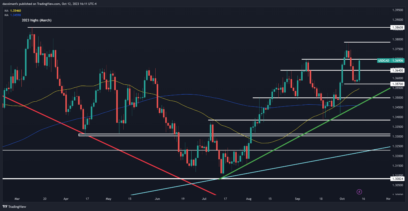 The U.S. dollar, as measured by the DXY, embarked on a furious rally on Thursday after hotter-than-expected U.S. September inflation data sent Treasury yields sharply higher and increased the likelihood that the Fed will deliver another quarter-point rate hike at its December meeting. In this context, the Loonie (CAD) and the Aussie (AUD) suffered a major setback and took a beating against the greenback, with both currencies nearing their weakest levels in several months. Detailed technical analyses for AUD/USD and USD/CAD are provided below in consideration of these developments. USD/CAD TECHNICAL ANALYSIS USD/CAD surged on Thursday, blasting past a key technical ceiling at 1.3640 and pushing towards the 1.3700 handle, another important level that could cap further advances. With a strong bullish momentum firmly in place for USD/CAD and prices following a well-defined uptrend, it may pose a considerable challenge for sellers to regain control of the market, suggesting that the path of least resistance may be higher. In terms of possible scenarios, if the pair manages to clear the 1.3700 mark decisively, the bears may throw in the towel, setting the stage to move towards the October’s swing high, which hovers just below the 1.3800 threshold. On further strength, the focus shifts to the 2023 peak. Conversely, if prices turn lower from their current position and begin to retreat unexpectedly, initial support is seen at 1.3640, but further losses could be in store on a push below this area, with the next downside target located at 1.3570. USD/CAD TECHNICAL CHART USD/CAD Chart Created Using TradingView AUD/USD TECHNICAL ANALYSIS Everything was going well for AUD/USD until earlier this week. The pair had bounced more than 2% from multi-month lows and was on a steady recovery trajectory, but then its rebound abruptly hit a roadblock when prices collided with trendline resistance and the 50-day simple moving average, situated just above the 0.6400 handle. Right after testing the 0.6400 area, sellers made a strong comeback, initiating a robust bearish reversal that pushed prices below support at 0.6350. With the market firmly in the grip of the bears, it may only be a matter of time before a move toward the 2023 lows unfolds. AUD/USD could find a foothold in this area on a retest, but in the event of a breakdown, we could see a pullback towards the 2022 lows. On the flip side, if sentiment improves and the Australian dollar accelerates higher, initial resistance is located at 0.6350. Clearing this hurdle may breathe fresh life into the upward impetus, potentially opening the path for an advance toward trendline resistance, currently positioned close to the psychological 0.6400 level. With continued strength, the prospect of reaching 0.6460 is worth considering. AUD/USD TECHNICAL CHART AUD/USD Technical Chart Prepared Using TradingView https://www.dailyfx.com/news/forex-usd-dollar-technical-setups-aud-usd-plummets-while-usd-cad-skyrockets-20231012.html