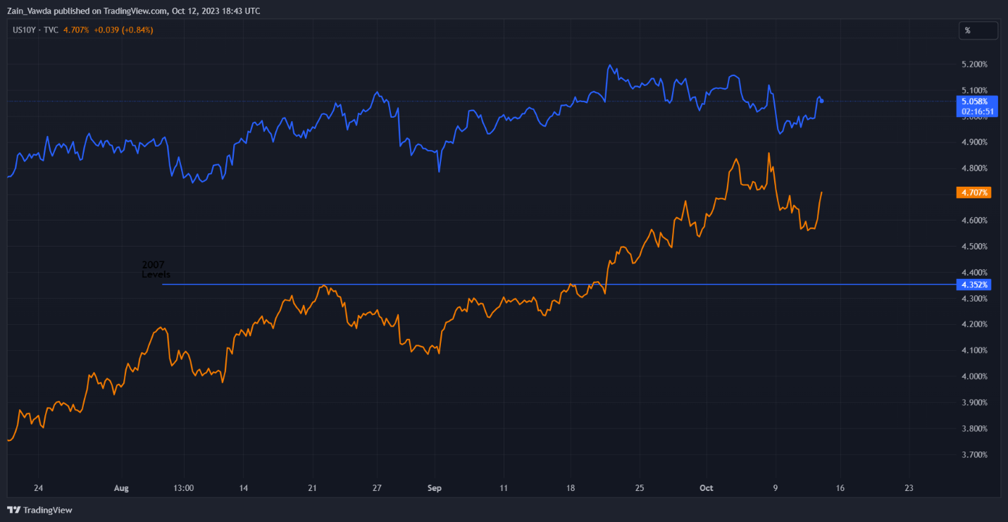S AND P 500 PRICE FORECAST: US CPI Weighs on Equities as the SP500 Grapples with a Death Cross Formation. US Long Term Yields Rise Supporting the Fed Narrative. US Bank Earning in Focus with JPMorgan Chase, Wells Fargo and Citigroup All Reporting Tomorrow. To Learn More About Price Action, Chart Patterns and Moving Averages, Check out the DailyFX Education Section. US Indices have run into trouble thanks to a combination of key resistance levels and a sticky Inflation print. The inflation data actually came in rather mixed in my opinion with the headline inflation number remaining at 3.7% but above estimates of 3.6%. Core inflation YoY however fell to a 24-month low of 4.1%. POST US CPI OUTLOOK AND BANK EARNINGS Despite the mixed nature of the US inflation data the US Dollar received a strong bid today as well as a sharp rise in long term US treasury yields. Now looking at the reaction and what I think has been the driving force of the rise in the US Dollar as well as the selloff in US equities comes back to Fed policymaker comments this week. A dovish tone was set for the majority of the week which kept the US Dollar on the back foot. Comments from Rafael Bostic yesterday however may explain some of the moves today. Bostic said the stalling inflation could force the Federal Reserve to “do more”. Today's print from a headline perspective can definitely be called sticky while with long term yield rates rising aggressively, even if the Fed do not hike rates again, today’s data still supports the narrative of “higher rates for longer”. US 2Y and 10Y Yield Chart Source: TradingView, Created by Zain Vawda Another explanation of the selloff in the S&P 500 could be down to some profit taking from the recent upside rally ahead of US bank earning due tomorrow. This however doesn’t seem likely as Bank earnings are expected to be positive owing to the higher rate environment which has allowed banks to rake in a substantial amount of revenue over the last 18 months. Either way markets will surely be keeping a close eye tomorrow on earnings season, with big banks including JPMorgan Chase, Wells Fargo and Citigroup reporting their quarterly numbers before the bell on Friday. We also have Michigan Consumer Sentiment data (Prel) due for release and we will hear more comments from Fed Policymaker Harker tomorrow as well. ECONOMIC CALENDAR For all market-moving economic releases and events, see theDailyFX Calendar S&P 500 TECHNICAL OUTLOOK Form a technical perspective, the S&P has bounced off a key area of support before rallying some 200 points toward the key resistance level resting at the 4400 mark. A further challenge for the S&P is the completion of a death cross pattern which would hint at further downside ahead as the 50-day MA crossed below the 100-day MA. The price remains compressed between the moving averages as they are spread within a 180-point range. At the time of writing the S&P has put in a slight bounce of the 20-day MA and remains on course for a bearish close with losses currently at 0.95% on the day. Key Levels to Keep an Eye On: Support levels: 4333 4280 4200 Resistance levels: 4400 4411 4459 S&P 500 October 12, 2023 Source: TradingView, Chart Prepared by Zain Vawda IG CLIENT SENTIMENT Taking a quick look at the IG Client Sentiment, Retail Traders have shifted to a more dovish stance with 50% of retail traders now holding long positions compared to 57% a day ago. https://www.dailyfx.com/news/s-p-500-slides-as-us-yields-rise-post-cpi-more-downside-ahead-20231012.html