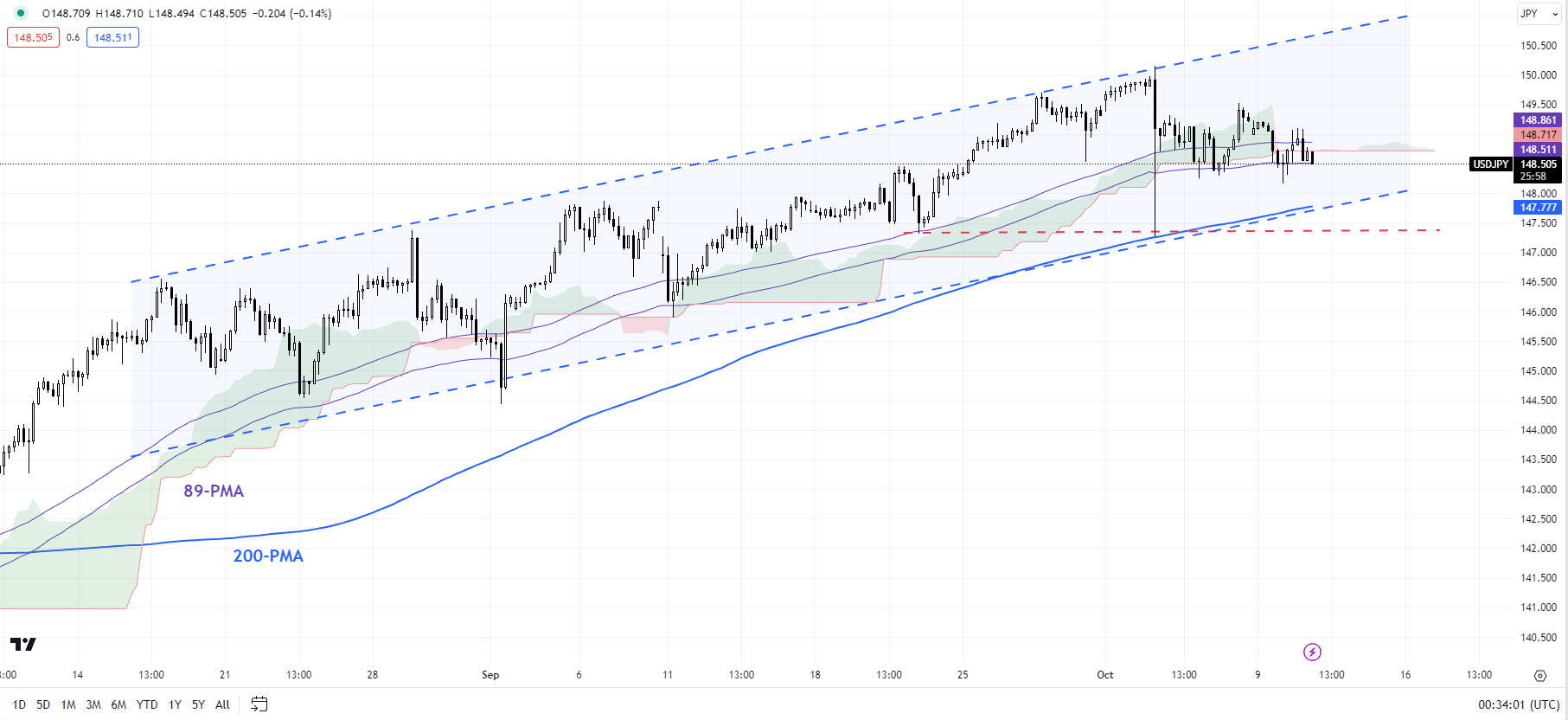 US DOLLAR, AUSTRALIAN DOLLAR, BRITISH POUND VS. JAPANESE YEN – PRICE ACTION: USD/JPY continues to hover below the psychological 150 mark. GBP/JPY is attempting to rise further; AUD/JPY is holding above key support. What is the outlook and what are the key levels to watch in select JPY crosses? Dovish comments from US Federal Reserve officials coupled with the violence in Israel and Gaza have put a lid on US Treasury yields, boosting the Japanese yen. Dallas Fed president Lorie Logan and Fed Vice Chair Philip Jefferson on Monday suggested that the sharp rise in yields has tightened financial conditions, lessening the need for further interest rate hikes. Markets are now pricing in around a 10% chance of a 25 basis points hike by the Fed when it meets next month, down from around a 28% chance a week ago. Moreover, the yen appears to have attracted some safe-haven bids on account of a flare up in geopolitical tensions. The pause in the yen’s slide against the US dollar is a welcome sign as it hovers in the range that invited intervention by Japanese authorities last year. The yen has been under pressure as BOJ’s persistent ultra-easymonetary policydiverges from its peers where central banks remain hawkish. USD/JPY 240-Minute Chart Chart Created by Manish Jaradi Using TradingView Having said that, unless global central banks take a step back from the hawkishness and/or BOJ steps up its hawkishness, the path of least resistance for the yen remains sideways to down. For more details, see “Japanese Yen Tumbles as BOJ Maintains Status Quo: USD/JPY Eyes 150,” published September 22. USD/JPY Daily Chart Chart Created by Manish Jaradi Using TradingView USD/JPY: 147.35 is key support USD/JPY continues to hold under stiff resistance at the psychological 150 mark, not too far from the 2022 high of 152.00. A potential lower high created last week raises the risk of a test of the 200-period moving average, around the early-October low of 147.35. This support is strong and may not break in the first attempt at least. Given the buoyant upward momentum on the daily chart, the pair could continue to hover in the 147.00-150.00 range in the interim. However, any break below 147.35 would confirm that the broader upward pressure was easing. GBP/JPY Daily Chart Chart Created by Manish Jaradi Using TradingView GBP/JPY: Bullish move ahead? GBP/JPY is now testing key resistance at last week’s high of 183.00. Any break above could clear the path up to the August high of 186.75. Importantly, the cross’ hold above strong converged support on the 89-day moving average confirms that the broader trend remains up and the recent sideways price action is a pause, rather than a reversal of the uptrend. AUD/JPY Weekly Chart Chart Created by Manish Jaradi Using TradingView AUD/JPY: Range likely AUD/JPY continues to hold above quite strong converged support at the 89-day moving average, the February high, and the lower edge of the Ichimoku cloud on the daily charts, ashighlighted in the previous update. However, unless the cross clears the June high of 97.70 the path of least remains sideways at best. https://www.dailyfx.com/news/japanese-yen-aided-by-fed-pause-view-geopolitics-usd-jpy-gbp-jpy-aud-jpy-20231011.html