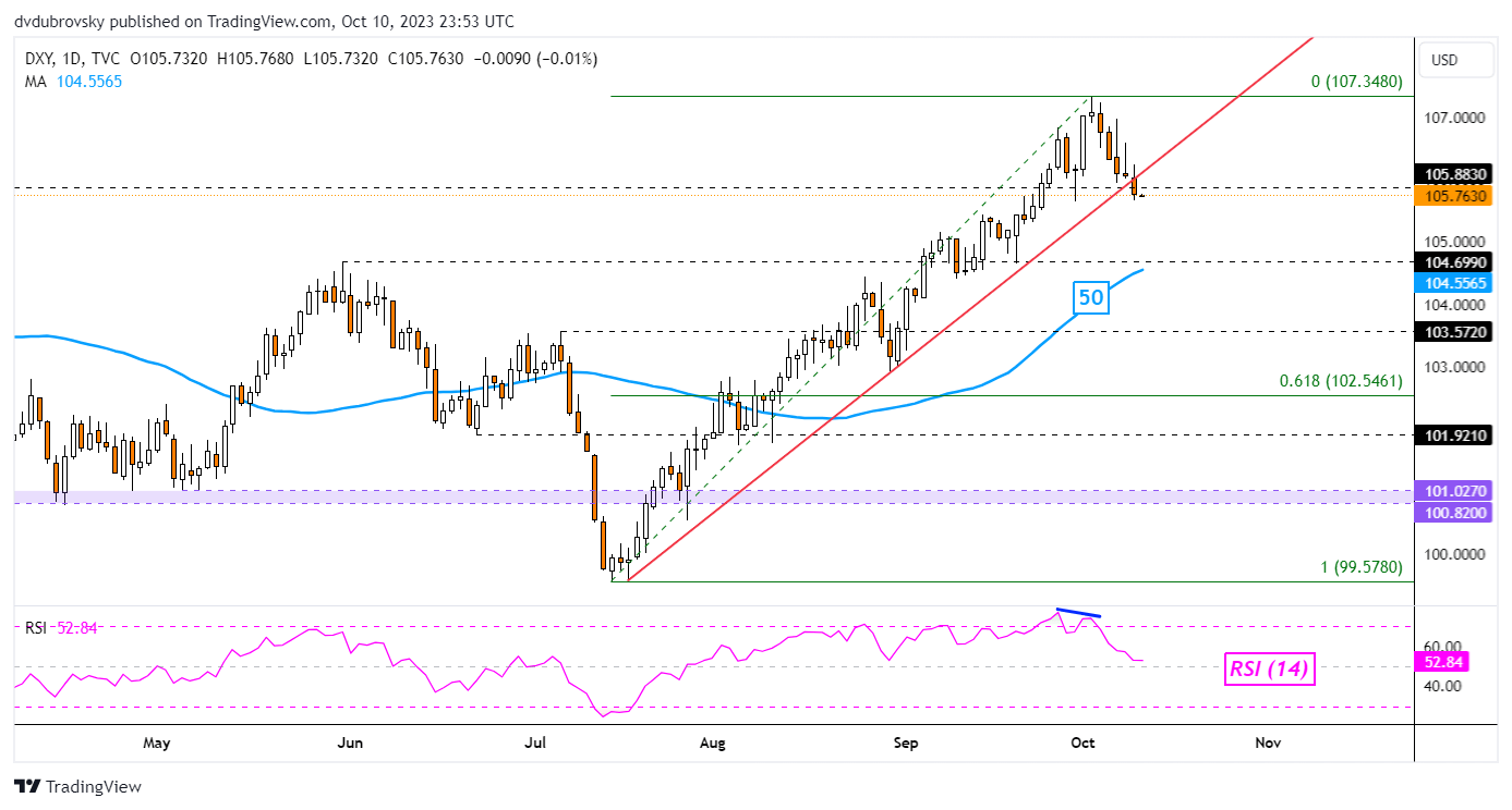 US DOLLAR, DXY, CPI PREVIEW – MARKET UPDATE: US Dollar on course for another weekly pullback so far All eyes on CPI data Thursday, will core inflation slow? DXY shows early signs of a brewing broader reversal The US Dollar (DXY Dollar Index) is heading for a loss this week so far ahead of the highly-anticipated Consumer Price Index (CPI) report. If losses are sustained, the -0.3% drop could be the worst 5-day performance since the middle of July. Meanwhile, things are looking increasingly bearish on the daily chart. Let us take a look at how the currency is shaping up ahead of the inflation report. On Thursday, US headline inflation is seen weakening to 3.6% y/y in September from 3.7% y/y in August. This is known as disinflation. Disinflation is a period where prices are still rising but at a slower pace compared to prior. This should not be confused with deflation (falling prices). Core CPI, which excludes volatile food and energy costs (underlying inflation), is seen dropping to 4.1% y/y from 4.3% prior. The Federal Reserve is probably more interested in the latter. It should be noted that from my fourth-quarter outlook, the lag effect of slowing rental property prices will likely continue making its way into core CPI. As such, this might continue pressuring core inflation lower in the coming months, which is what I am expecting from this report on Thursday. Such an outcome would likely support recent cautious commentary coming from the Federal Reserve, which has been adding slight downward pressure to Treasury yields. In turn, that has been pushing the US Dollar lower, particularly as stock markets rise again. This results in less demand for safety, which works against the haven-linked currency. US Dollar Technical Analysis Taking a look at the DXY daily chart below, we can see that the currency broke under a key rising trendline from July. While confirmation is lacking, this could be an early indication of an impending reversal. This also follows negative RSI divergence, showing that upside momentum was fading leading into the turn lower. From here, key support is the 104.69 inflection point below. DXY Daily Chart Chart Created in TradingView https://www.dailyfx.com/news/us-dollar-faces-reversal-risk-ahead-of-inflation-report-as-dxy-breaks-key-trendline-20231011.html