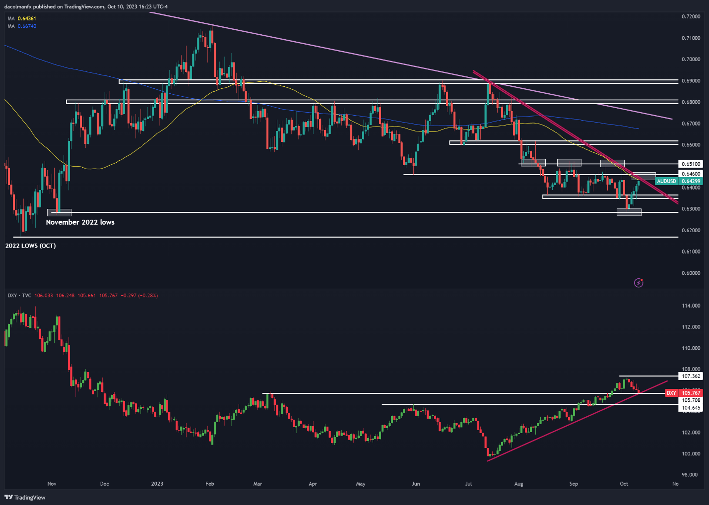 AUD/USD TECHNICAL OUTLOOK AUD/USD rises for the fourth straight day, pressing against trendline resistance. Despite its recent recovery, the Aussie maintains a bearish profile. This article looks at AUD/USD’s key technical levels worth watching in the coming trading sessions Market sentiment has improved in recent days, allowing AUD/USD to make a moderate turnaround from the middle of last week, when it briefly hit its lowest level since November last year. The Aussie's recovery phase has coincided with the pullback in the broader U.S. dollar, which has been correcting lower for the past four trading sessions, as shown in the daily chart below. Despite the rebound, AUD/USD maintains a negative profile in the near term, with the exchange rate significantly below important moving averages and situated beneath a short-term descending trendline that has been guiding the market lower since July. However, the tide could turn in the pair’s favor if the bulls manage to take out overhead resistance, stretching from 0.6440 to 0.6460. In the event that prices breach the 0.6440/0.6460 ceiling decisively, buying momentum could gather pace, setting the stage for a rally towards 0.6510. With continued strength, the bullish camp might gain the confidence to mount an assault on the psychological 0.6600 handle. Beyond that threshold, the focus transitions to the 200-day simple moving average. On the flip side, should sellers reemerge and initiate a bearish reversal from current levels, the first relevant support area rests around 0.6350. AUD/USD may find stability around this floor during a pullback before bouncing back, but in the case of a breakdown, downward pressure could intensify, laying the groundwork for a descent towards the 2023 lows a touch below 0.6300. AUD/USD TECHNICAL CHART AUD/USD Chart Prepared Using TradingView https://www.dailyfx.com/news/forex-australian-dollar-forecast-aud-usd-takes-on-trendline-resistance-what-s-next-20231010.html