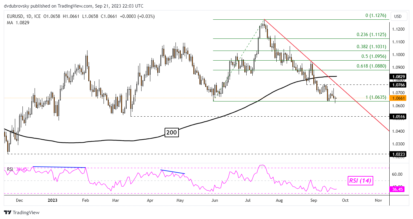 EURO, EUR/USD, TECHNICAL ANALYSIS, RETAIL TRADER POSITIONING – IGCS UPDATE Euro is on course for an 11th consecutive weekly loss Retail traders maintaining increasingly bearish bets EUR/USD on course to set new lows for this year? The Euro fell about -0.5 percent against the US Dollar on Monday. Now, EUR/USD is on course for an 11th consecutive weekly loss, matching the longest losing streak on record back in 1997. In response, retail traders have increased upside exposure. This can be seen by taking a look at IG Client Sentiment (IGCS), which often functions as a contrarian indicator. With that in mind, will the Euro extend its losing streak? EUR/USD Sentiment Outlook – Bearish The IGCS gauge shows that about 72% of retail traders are net-long EUR/USD. Since the majority of them are biased to the upside, this continues to hint that prices may fall down the road. This is as upside exposure increased by 12.82% and 6.9% compared to yesterday and last week, respectively. With that in mind, the combination of overall positioning and recent changes produces a stronger bearish contrarian trading bias. Euro Daily Chart On the daily chart below, EUR/USD broke under the 61.8% Fibonacci extension level at 1.0631. That has exposed the March low of 1.0516 as immediate support. Meanwhile, the falling trendline from July continues to guide the exchange rate lower. As such, in the event of a turn higher, the trendline may hold as key resistance, maintaining a broadly bearish technical bias. Meanwhile, confirming a breakout under the March low. Establishing new lows for this year exposes the 100% level at 1.0436. Chart Created in Trading View https://www.dailyfx.com/analysis/euro-sets-the-stage-for-an-eleventh-weekly-loss-where-will-eur-usd-find-support-20230925.html