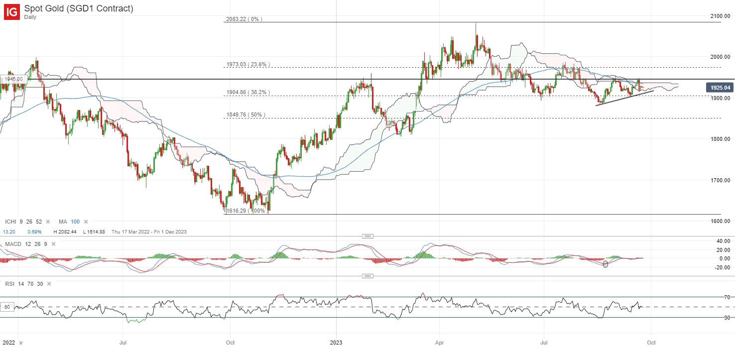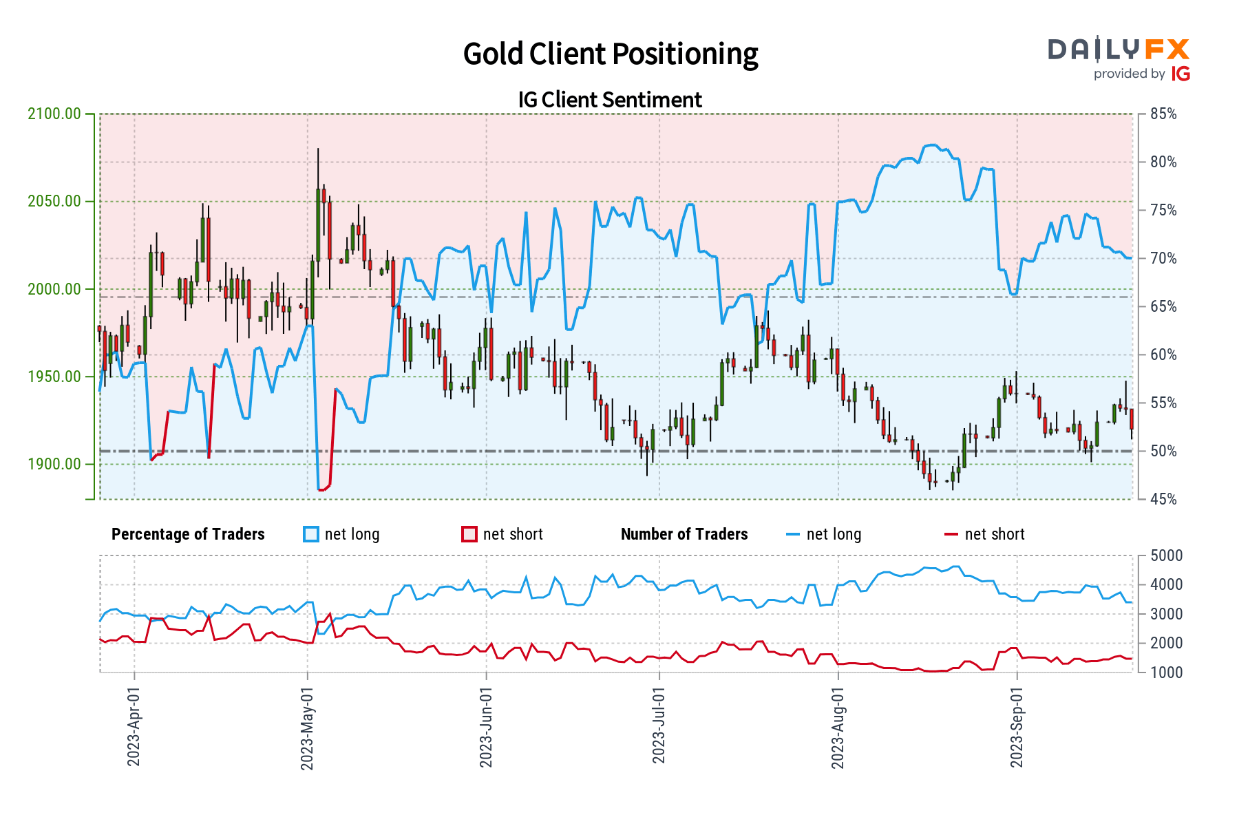 GOLD, RETAIL TRADER POSITIONING, TECHNICAL ANALYSIS – IGCS UPDATE Gold prices extend losses in the aftermath of the Fed Retail traders are increasing their upside exposure This is a sign of more pain to come from XAU/USD Gold prices fell about -0.6 percent over the past 24 hours as financial markets continued digesting the aftermath and implications of the Federal Reserve interest rate decision. In response, retail traders have increased bullish exposure in the precious metal. This can be seen by looking at IG Client Sentiment (IGCS), which often functions as a contrarian indicator. Gold Sentiment Outlook - Bearish The IGCS gauge shows that about 74% of retail traders are net-long gold. Since most are biased to the upside, this things that prices may continue falling down the road. Meanwhile, upside bets have increased by 8.02% and 5.9% compared to yesterday and last week, respectively. With that in mind, the combination of overall positioning and recent changes produces a stronger bearish contrarian trading bias. XAU/USD Daily Chart On the daily chart, recent losses have continued pushing gold lower towards rising support from February. At the same time, near-term falling resistance from July is offering a downside trajectory. As the two trendlines converge, this brings prospects of a breakout increasingly sooner. Key support is the rising trendline, as well as the 38.2% Fibonacci retracement level of 1903.46. Breaking lower would open the door to an increasingly bearish bias, placing the focus on the August low of 1884.89. Otherwise, a turn higher and breakout through the falling trendline exposes the 23.6% Fibonacci retracement level of 1971.63. That would offer a shift to an increasingly bullish technical outlook. Chart Created in Trading View https://www.dailyfx.com/analysis/gold-price-extend-losses-in-the-aftermath-of-the-fed-xau-usd-upside-bets-grow-20230921.html