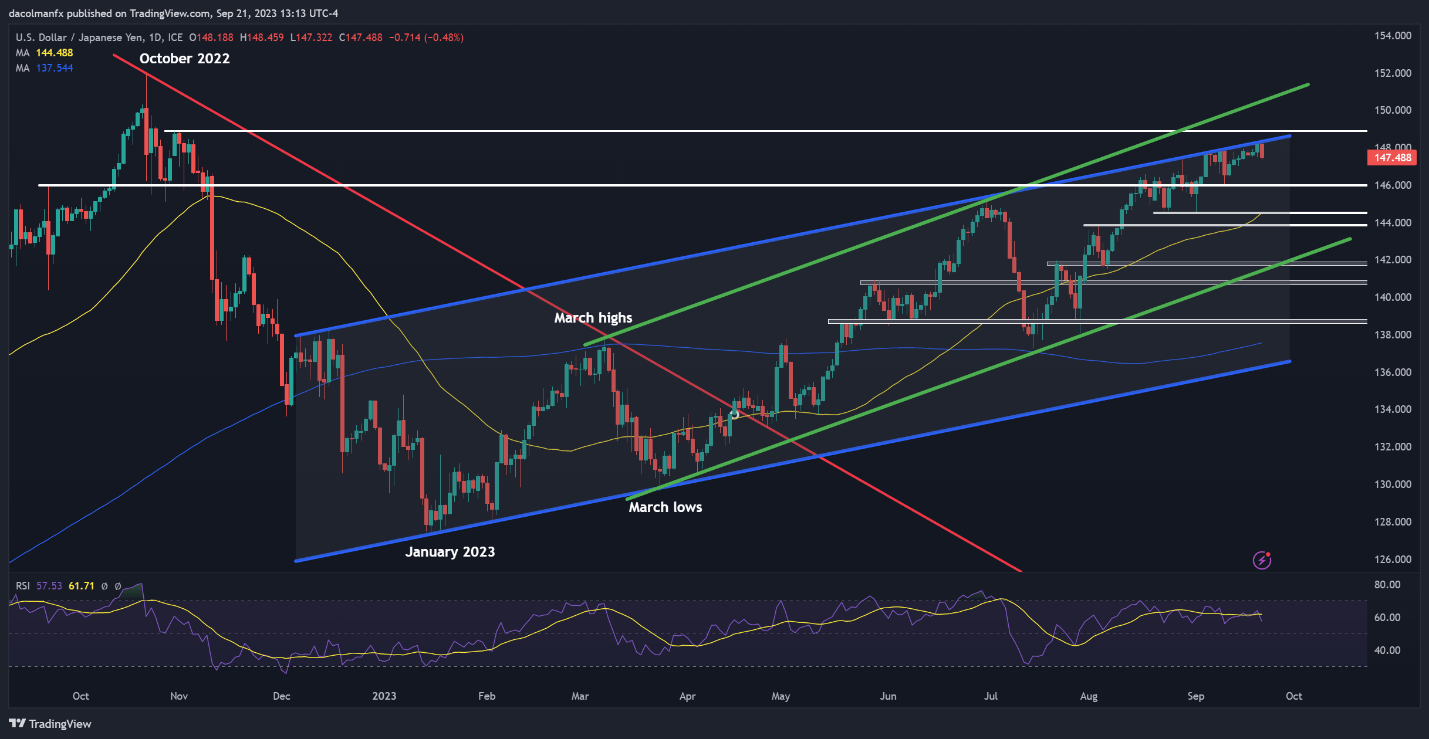 JAPANESE YEN - USD/JPY OUTLOOK Bank of Japan’s decision on Friday will steal the limelight. BoJ is expected to stand pat on monetary policy, but could subtly signal that a change in strategy in looming on the horizon. This article looks at key USD/JPY levels to watch in the coming days The Bank of Japan will announce its September decision on Friday following the Fed’s verdict on Wednesday. The institution, led by Kazuo Ueda, is largely expected to stand pat on monetary policy, holding its key interest rate steady at -0.10% and keeping its yield curve control program unchanged. In terms of forward guidance, the BoJ is likely to maintain its characteristic dovish tone, but may slowly start laying the groundwork for an exit from its ultra-accommodative stance to prevent market disruptions and minimize surprises when the actual policy shift begins to unfold. Governor Ueda recently indicated that sufficient data on consumer prices may be available by the end of the year to make a decision on possible increases in borrowing costs. These comments suggest that there is a growing inclination among policymakers to consider moving away from negative interest rates. With headline inflation running above the 2% target for more than a year, excessive yen devaluation and oil prices on a tear, it wouldn’t be surprising to see a less dovish central bank. While ‘less dovish’ does not equal ‘hawkish’, it would still be a departure from the old status quo. Any subtle change in the overall message that signals the central bank is finally starting to consider the possibility of adopting a less accommodative posture could be bullish for the Japanese yen, creating the right conditions for a brief rally against the U.S. dollar. In the event of a USD/JPY pullback, the reversal could be of temporary nature, as multi-year highs in U.S. Treasury yields, particularly those on the long end of the curve, will continue to support the greenback's attractiveness in the FX market for the foreseeable future. USD/JPY TECHNICAL ANALYSIS USD/JPY fell towards 146.00 early last week, but found support and quickly rebounded, rising towards channel resistance near 148.00 in recent days. Despite its constructive bias, the pair has been unable to clear the 148.00 barrier decisively, with the bulls being repeatedly rebuffed in this region. After latest rejection, sellers have gained some impetus, pushing the exchange rate towards 147.50 at the time of writing. If the pullback deepens in the coming sessions, initial support is seen at 145.90, followed by 144.55. On further weakness, the crosshairs will be fixed on 143.85. On the flip side, if market momentum shifts in favor of buyers again, the first technical ceiling to watch is located around 148.00. Upside clearance of this resistance could reinforce upside pressure, opening the door for a move towards 148.80 and 150.00 thereafter. USD/JPY TECHNICAL CHART USD/JPY Chart Prepared Using TradingView https://www.dailyfx.com/news/forex-japanese-yen-forecast-bank-of-japan-may-rock-the-boat-for-usd-jpy-how-20230921.html