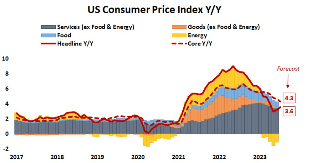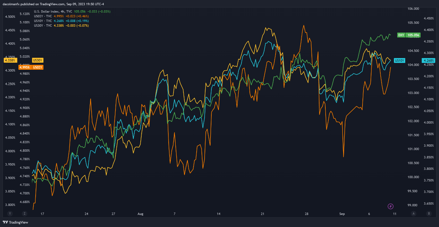 US DOLLAR OUTLOOK The U.S. dollar index advanced and settled near its highest level since early March on Friday, rising for the eighth consecutive week The greenback's recent upward momentum has been driven by rising bond yields in an environment of resilient economic activity and sticky inflation The August U.S. CPI report will steal the spotlight in the coming week and will likely set the tone for the FX markets in the near term The U.S. dollar, as measured by the DXY index, closed the week above the psychological 105.00 handle, settling around its highest level since early March. This marked its eighth consecutive week of gains and the longest winning streak since 2014 – a bullish run catalyzed by the resurgence in U.S. Treasury yields on the back of a hawkish repricing of the Federal Reverse’s policy path. The chart below shows how the DXY index has closely tracked the uptrend in U.S. bond yields since mid-July. US DOLLAR INDEX VERSUS US TREASURY YIELDS Source: TradingView The FOMC has raised borrowing costs 11 times since 2022 as part of a strategy to quash rampant inflation, bringing its benchmark rate to a range of 5.25% to 5.50%, the highest in 22 years. Despite the forceful actions by the Fed, the current tightening cycle is likely not yet over, considering the prevailing macroeconomic conditions. Recent data has shown that the economy, rather than weakening, has reaccelerated this summer, contrary to historical experience in times of aggressive central bank monetary policy. For instance, the ISM services sector PMI jumped in August to 54.5 from 52.7 previously, topping all projections and reaching its strongest reading since February. Given these positive developments, the Atlanta Fed's GDP Nowcast indicates that output is poised to grow at an annualized rate of 5.6% in the third quarter. The resilience of the economy, coupled with tight labor markets, will keep household spending healthy for now, putting upward pressure on aggregate demand – a key driver of inflation. This could compel policymakers to deliver additional tightening this year despite their pledge to “proceed carefully” going forward. Turning our attention to the forthcoming FOMC meetings, investors anticipate no change in the policy stance in September, but see the November conclave as “live”, with a 43.6% probability assigned to a quarter-point hike. This likelihood may increase in the days ahead, particularly if the upcoming U.S. inflation report reflects heightened inflationary pressures. FOMC MEETING PROBABILITIES Source: CME Group The U.S. Bureau of Labor Statistics will release August consumer price numbers on Wednesday. Projections suggest headline CPI rose 0.6% m/m last month, pushing the annual rate to 3.6% from 3.2% in July. The core gauge, for its part, is seen climbing 0.2% m/m, with the 12-month reading easing to 4.3% from 4.7% prior. An upward deviation of the actual data from market estimates would be positive for the U.S. dollar insofar as it would strengthen the case for further policy firming. Conversely, if the results align with or fall short of expectations, the greenback could suffer a setback, erasing some of its recent gains and losing ground against its top peers. US ECONOMIC CALENDAR Source: DailyFX US DOLLAR INDEX (DXY) TECHNICAL ANALYSIS The U.S. dollar broke out on the topside this past week, clearing trendline resistance and its May peak decisively before setting a fresh multi-month high above the 105.00 handle ahead of the weekend. With the bulls in clear control of the market, the DXY index might maintain its upward momentum in the coming days, particularly if it manages to remain above technical support at 104.50. In such a scenario, prices may charge towards 105.30, a key ceiling created by the 38.2% Fib retracement of the September 2022/July 2023 slump. On further strength, a retest of the 2023 highs becomes increasingly probable. On the flip side, if sellers regain the upper hand and trigger a pullback, initial support appears at 104.50, followed by 103.95. Below these thresholds, the next area of significance in the event of extended weakness is situated at 103.50. US DOLLAR (DXY) TECHNICAL CHART US Dollar Index (DXY) Chart Prepared Using TradingView https://www.dailyfx.com/news/forex-us-dollar-forecast-how-will-us-inflation-data-impact-yields-and-usd-20230910.html