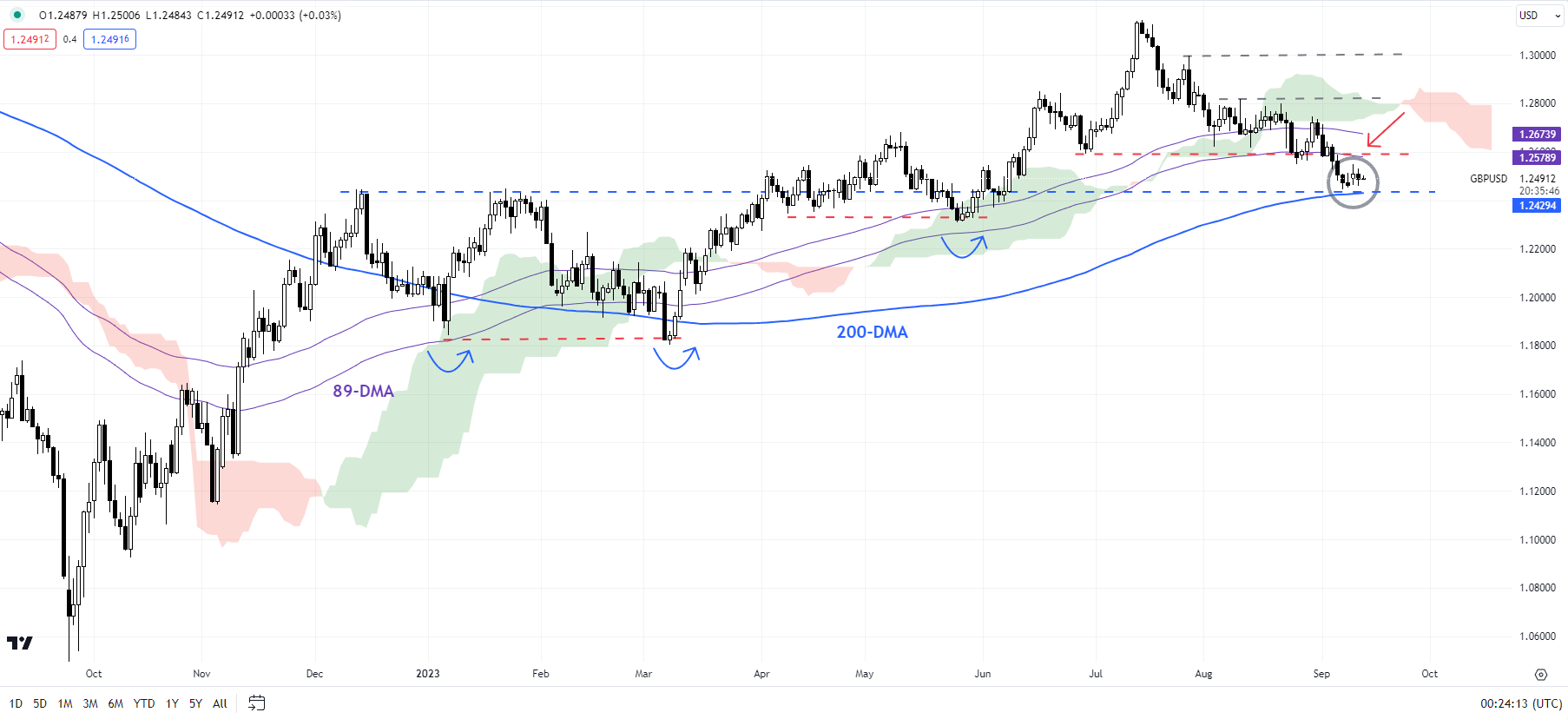 BRITISH POUND VS US DOLLAR, EURO, JAPANESE YEN – PRICE SETUPS: Still-hot UK wage growth hasn’t translated into higher GBP/USD yet. EUR/GBP is holding above vital support, frustrating bears. GBP/JPY continues to be well guided by a rising channel. What is the outlook and key levels to watch in select GBP crosses? The British pound is testing crucial support against the US dollar ahead of UK GDP data due later Wednesday. The pound has been underperforming against some of its peers in recent weeks and so far, there is no sign of reversal. For more discussion on the underperformance, see “See “Pound’s Resilience Masks Broader Fatigue: GBP/USD, EUR/GBP, GBP/JPY Setups,” published August 23. The mixed UK jobs data on Tuesday did little to alter the soft bias. The blistering wage growth seals the case for a 25-basis points rate hike by the Bank of England (BoE) when it meets on September 22. BoE Governor Andrew Bailey last week said interest rates might still rise further due to stick price pressures, but the central bank is “much nearer” to ending its tightening cycle. The key focus now shifts to UK GDP for July – expected 0.4% on-year, down from 0.9% in June. The three-month average, however, ticked up to 0.3% in July from 0.2% previously. GBP/USD Daily Chart Chart Created by Manish Jaradi Using TradingView GBP/USD: Testing vital support On technical charts, the failure so far this month to rise past immediate resistance at the early-August high of 1.2820 has kept the downward bias intact for GBP/USD – a risk highlighted in the previous update. Furthermore, in a sign of weakness, GBP/USD has failed to hold above vital converged support on the 89-day moving average, the lower edge of the Ichimoku cloud on the daily charts, and the end-June low of 1.2600. On the previous two occasions since the end of 2022, the pair has rebounded from similar support (see the daily chart). GBP/USD 240-Minute Chart Chart Created by Manish Jaradi Using TradingView The pair is now testing a crucial cushion on the 200-day moving average – the last time it was decisively below this average was in 2022. So, a hold above is key for the broader bias to stay constructive. From a medium-term perspective, the rise in July to a multi-month high has confirmed the higher-tops-higher-bottom sequence since late 2022, leaving open the door for some medium-term gains. GBP/USD Monthly Chart Chart Created by Manish Jaradi Using TradingView Importantly, as pointed out late last year, a higher high this year (relative to 2022) could be unfolding into something more than just a corrective rebound, that is, it opens the door for a reversal of GBP/USD’s medium-term downtrend (first highlighted in October – see “GBP/USD Technical Outlook: Forming an Interim Base?” published October 3. Whether the medium-term rebound is the start of a long-term uptrend? To be fair, such evidence is lacking. GBP/USD remains below major resistance on the 89-month moving average and the Ichimoku cloud on the monthly charts, coinciding with a downtrend line from 2014, suggesting the long-term downtrend is yet to reverse. EUR/GBP Daily Chart Chart Created by Manish Jaradi Using TradingView EUR/GBP: Still holding above Q2-2023 support line EUR/GBP continues to hold above the converged floor on a horizontal trendline from June and another horizontal trendline since late 2022 (at about 0.8550-0.8600). Still, unless the cross clears resistance at the mid-July high of 0.8700, the path of least resistance is sideways to down. GBP/JPY Daily Chart Chart Created by Manish Jaradi Using TradingView GBP/JPY: Consolidation within the uptrend GBP/JPY has continued to be well-guided by the rising Pitchfork channel since early 2023. However, most recently the cross has been struggling to hold above the resistance-turned-support at the July high of 184.00. A decisive break below would indicate that the immediate upward pressure had faded but won’t necessarily imply a reversal of the broader uptrend. Only a break below the July low of 176.25 would puncture the broader uptrend. https://www.dailyfx.com/news/british-pound-ahead-of-uk-gdp-gbp-usd-eur-gbp-gbp-jpy-setups-20230913.html