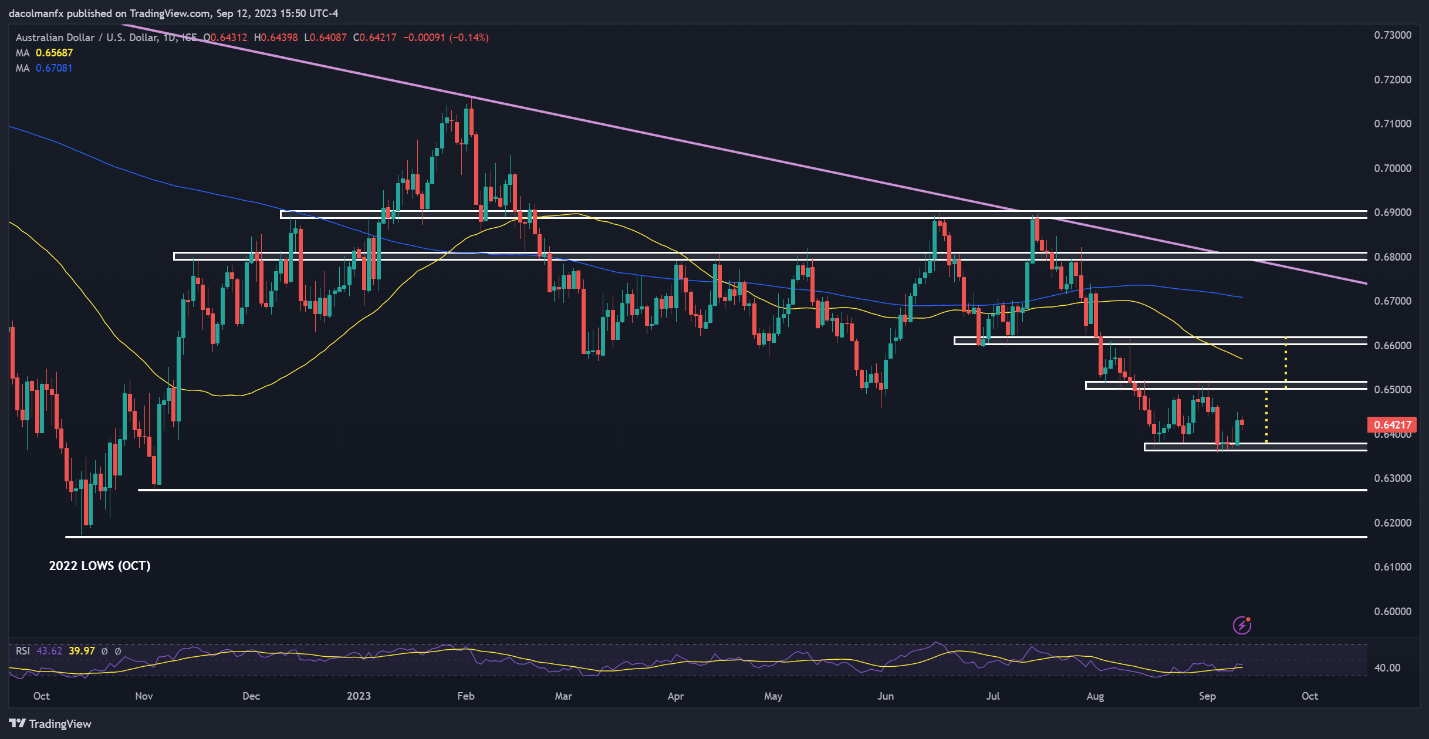 AUD/USD FORECAST: AUD/USD slides and fails to build on Monday’s gains, in a trading session marked by some risk aversion and moderate U.S. dollar strength Despite Tuesday’s subdued performance, AUD/USD seems to be in the process of forging a double bottom The Australian dollar was muted on Tuesday, unable to consolidate Monday's gains in a trading session marked by risk aversion and moderate U.S. dollar strength. Despite Tuesday’s subdued performance, AUD/USD seems to be in the process of forging a double bottom, which normally tends to presage the exhaustion of selling pressure prior to a rebound. To delve into more detail, a double bottom is a reversal pattern that consists of two similar troughs separated by a crest in the middle that often emerges in the context of an extended downtrend. Confirmation of this bullish configuration occurs when the asset in question completes the "W" shape and breaks above neckline resistance, defined by the intermediate peak. To assess the potential extent of the price increase following the validation of the double bottom, traders can project its height vertically from the point of breakout. This estimation offers a practical approximation of the expected move's magnitude, offering valuable guidance when considering trading strategies and risk management. Zooming in on the specific case of AUD/USD, neckline resistance currently lies at 0.6500/0.6510. If the pair manages to take out this barrier in a clean and decisive manner, it could spark increased buying momentum, paving the way for a climb beyond the psychological 0.6600 level. For more robust confirmation signals, it's crucial to examine volume data. In this context, low-volume activity during the formation of the second bottom, followed by a surge in volume during the breakout, serves to reinforce the pattern's bullish bias. On the flip side, if sellers reassert themselves and push prices lower, support is seen at 0.6360. Downside clearance of this floor would nullify the double bottom, creating the right conditions for a drop towards 0.6275. On further weakness, the focus shifts to 0.6170. AUD/USD TECHNICAL CHART AUD/USD Technical Chart Created Using TradingView https://www.dailyfx.com/news/forex-australian-dollar-outlook-aud-usd-falls-yet-bullish-double-bottom-holds-promise-20230912.html