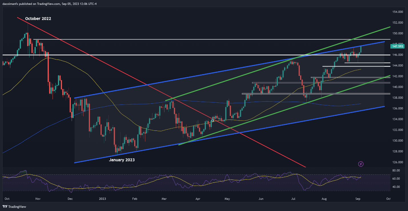 USD/JPY KEY POINTS The U.S. dollar, as measured by the DXY index, gains on soaring yields, boosting USD/JPY to its higher level since November 2022 The fundamental picture remains negative for the Japanese yen against the U.S. currency This article discusses the main technical levels of the USD/JPY pair that Forex traders should be aware of in the coming days. The U.S. dollar index soared to a six-month peak on Tuesday (104.90) on the back of a strong advance in U.S. government rates. Against this backdrop, USD/JPY (U.S. dollar - Japanese yen) staged a solid rally, rising around 0.8% to 147.65 in early afternoon trading in New York, hitting its highest level since November 2022 and coming within striking distance from clearing a key ceiling located just a touch below the 148.00 handle. The predominant driving force behind the U.S. dollar's bullish momentum since mid-July has been the surge in yields. Although the Fed’s pledge to “proceed carefully” may put a lid on this uptrend, the resilience of the U.S. economy and surging oil prices will likely ensure rates remain elevated across the curve for the foreseeable future, putting upward pressure on USD/JPY. From a technical standpoint, USD/JPY briefly dipped toward 144.55 late last week, but was ultimately repelled to the upside, with buyers reclaiming decisive control of the market following the support rejection. The pair has since gained additional ground, as shown in the chart below, where prices are seen steadily progressing toward the channel resistance at 147.75. In terms of possible scenarios, successfully piloting above the 147.75 barrier could reinforce buying impetus, setting the stage for a rally toward 149.00. On further strength, we could see a climb towards the psychological 150.00 level. In case of setback and bearish reversal, initial support appears at 146.00, followed by 144.55. Further down the line, the next area of interest is located at 143.85. USD/JPY TECHNICAL CHART USD/JPY Chart Created Using TradingView https://www.dailyfx.com/news/forex-japanese-yen-forecast-usd-jpy-blasts-off-as-broader-us-dollar-breaks-out-20230905.html
