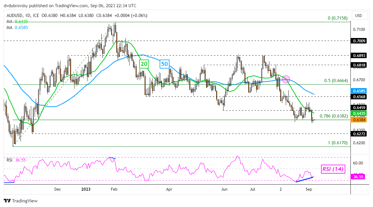 AUSTRALIAN DOLLAR, AUD/USD, AUD/JPY, SYMMETRICAL TRIANGLE – TECHNICAL UPDATE: Australian Dollar remains pressured after recent losses AUD/USD closed at its lowest since early November Meanwhile, AUD/JPY is facing a Symmetrical Triangle The Australian Dollar closed at its weakest against the US Dollar since early November, opening the door to extending the broader downtrend since the beginning of this year. This is being reinforced by a Bearish Death Cross between the 20- and 50-day Moving Averages (MA) from August, with the former line recently holding as resistance. But, AUD/USD faces positive RSI divergence. This is a sign of fading downside momentum, which can at times precede a turn higher. Still, in such an outcome, the MA’s could hold as resistance, maintaining the downside technical bias. Otherwise, extending lower places the focus on the November 3rd low of 0.6272 before the 2022 bottom of 0.6170 kicks in. Chart Created in TradingView Meanwhile, against the Japanese Yen, the Australian Dollar is facing a different technical situation. A Symmetrical Triangle chart formation has been brewing since earlier this year. Now, AUD/JPY is quickly running out of space to consolidate between rising support and falling resistance. The direction of the breakout could be key for preceding the broader trend. In the event of an upside breakout, key resistance is the 23.6% Fibonacci retracement level of 94.93. Extending gains could open the door to revisiting the June high of 97.67. Otherwise, key support is the 38.2% level of 93.23. Below the latter sits the midpoint at 91.86. A stronger bearish technical conviction could see the exchange rate drop towards the 61.8% level of 90.49. Chart Created in TradingView https://www.dailyfx.com/analysis/australian-dollar-technical-update-aud-usd-faces-support-aud-jpy-a-symmetrical-triangle-20230907.html