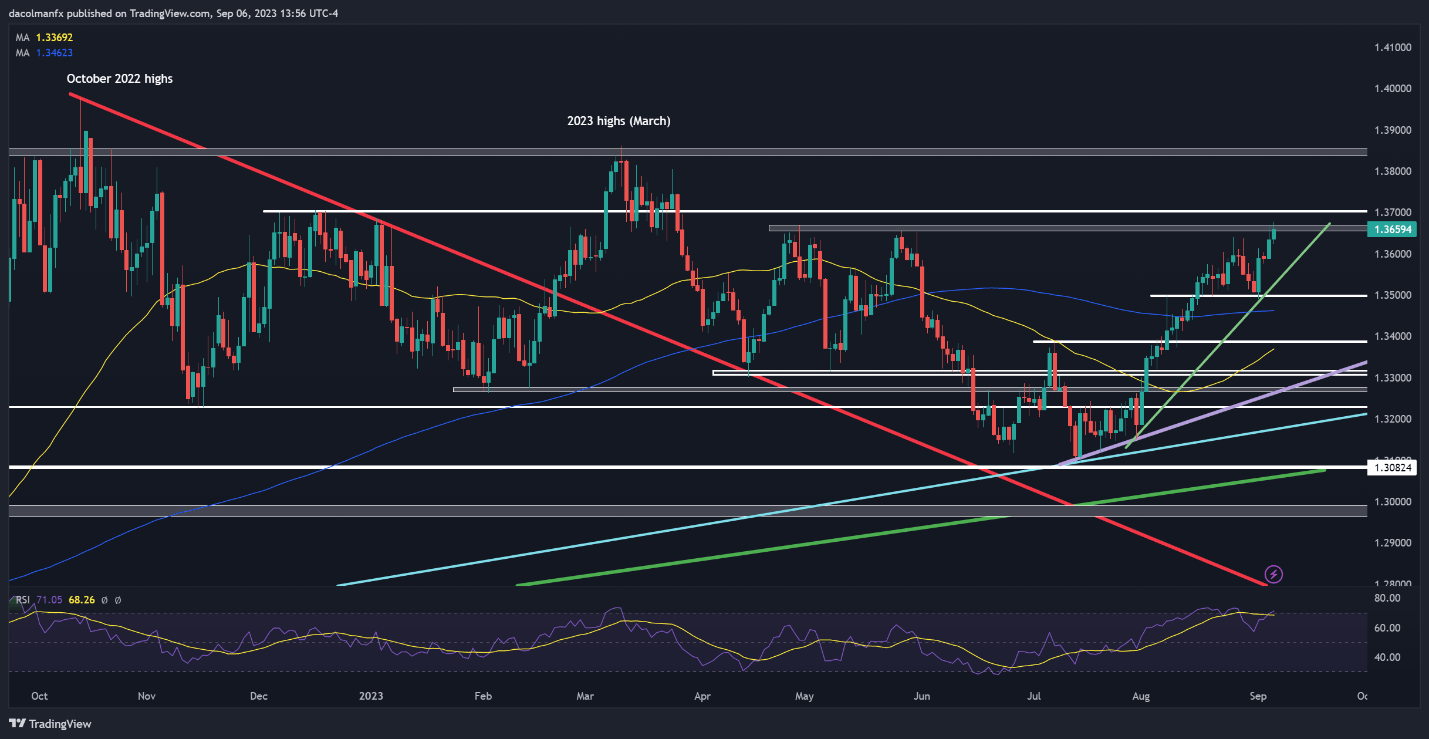 USD/CAD FORECAST USD/CAD rises as U.S. Treasury yields push higher following strong U.S. economic data Bank of Canada keeps interest rates unchanged, but says additional hikes should not be ruled out BoC’s hawkish hold fails to support the Canadian dollar, as the broader U.S. dollar drives FX market dynamics The Canadian dollar was a touch softer on Wednesday despite Bank of Canada’s hawkish hold, as the broader U.S. dollar retained a positive bias following remarkably strong U.S. economic numbers. In late afternoon trading in New York, USD/CAD was up about 0.17% to 1.3657, probing a key resistance zone and hovering around its best levels since late March. Better-than-expected U.S. service sector activity data boosted U.S. Treasury yields across most maturities, increasing the likelihood that the FOMC will deliver additional tightening this year and maintain a restrictive stance for an extended period to ensure a sustained convergence of inflation towards the 2.0% target. This sequence of events created a supportive environment for the greenback. With riskier currencies on offer, the Canadian dollar struggled, shrugging off BoC’s monetary policy announcement. By way of context, the institution led by Governor Tiff Macklem held interest rates steady at 5.0%, but left the door ajar to the possibility of more policy firming in light of little downward momentum in underlying inflation. While the BoC’s message indicates future rate hikes are possible, markets remained skeptical amid looming economic headwinds. The central bank acknowledged the current difficulties, noting that the economy has entered a period of weaker growth, coinciding with a decline in consumption and housing activity. Against this backdrop, traders saw little need to reprice higher the bank's terminal rate. Looking ahead, the relative strength of the U.S. economy compared to its Canadian counterpart, along with the Fed's more favorable position to implement further policy tightening, could provide USD/CAD with room for further upward movement, particularly if market volatility picks up and risk aversion takes hold. This could mean fresh multi-month highs for the pair in the near term. USD/CAD TECHNICAL ANALYSIS USD/CAD continued its upward trajectory, marking the fourth consecutive day of gains on Wednesday, but it encountered resistance in the 1.3665 region, struggling to push past it decisively. Despite this initial hesitation, the pair remains well-positioned to breach this barrier at any moment, with the 1.3700 psychological level emerging as an area of interest in the event of a bullish breakout. Moving higher, the next critical ceiling is located at 1.3850, near the 2023 peak. On the flip side, if USD/CAD gets rejected from current levels and shifts downward, the first technical support to keep an eye on rests at 1.3540, followed by 1.3500. Further down the line, the next relevant floor is situated in the vicinity of the 200-day simple moving average. USD/CAD TECHNICAL CHART USD/CAD Chart Created Using TradingView https://www.dailyfx.com/news/forex-canadian-dollar-outlook-usd-cad-on-cusp-of-breakout-despite-boc-s-hawkish-hold-20230906.html