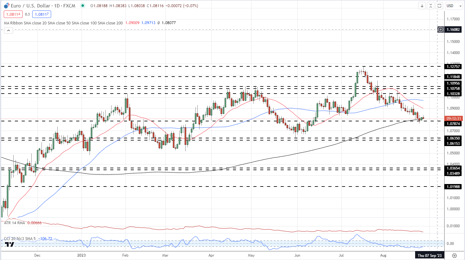 EUR/USD AND EUR/JPY FORECAST - PRICES, CHARTS, AND ANALYSIS Heavyweight US and Euro Area data are on tap this week. The US dollar remains undecided after chair Powell’s Jackson Hole speech. The Federal Reserve and the European Central Bank both reiterated their stance of keeping rates higher for as long as it takes at the Jackson Hole Symposium last week, leaving EUR/USD traders with little to work with. Fed chair Powell gave the market a very gentle dovish nod when he said that the central bank would ‘proceed carefully’ when assessing future policy moves, while President Lagarde said that while progress was being made, ‘the fight against inflation is not yet won’. Both central bank heads remain data-dependent and unless inflation begins to fall sharply, rates are set to be held at current levels in the coming months. Inflation readings for Germany, the Euro Area, and the US are due this week and this is likely to give EUR/USD traders the volatility that has been lacking of late. At the end of the week, the latest monthly US Jobs Report (NFPs) will be released at 13:30 UK and this again may provide a shot of price action going into the weekend. DailyFX Calendar The daily EUR/USD chart shows medium-term EUR/USD weakness and the short-term state of indecision. The pair have fallen from the mid-July high of 1.1276 with little in the way of support stemming the move. EUR/USD now sits on the 200-day simple moving average with a break below here leaving the May 22 swing high at 1.0787 vulnerable. Below here there is little in the way of support ahead of the late-May swing low at 1.0635. A clear break and open below the 200-dsma leaves the pair vulnerable to a move lower. EUR/USD DAILY PRICE CHART – AUGUST 29, 2023 Chart via TradingView In contrast to EUR/USD, the latest EUR/JPY chart sees the pair looking to re-test a multi-year high. A break above 159.65 would see the pair back at highs last seen in September 2008. All three simple moving averages continue to support the move higher. The main sticking point is the Bank of Japan and whether they will step in and try to support the Yen. The Bank’s normal modus operandi is to try and talk the market down before they actually make a policy change. This leaves the Yen vulnerable to a sharp move higher against a range of currencies, especially the ones where multi-year levels are seen. EUR/JPY may move higher but caution is warranted. EUR/JPY DAILY PRICE CHART – AUGUST 29, 2023 https://www.dailyfx.com/news/euro-eur-latest-eur-usd-struggles-continue-eur-jpy-eyes-a-fresh-multi-year-high-20230829.html