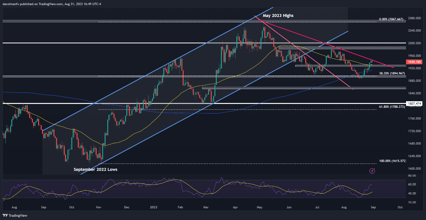 GOLD PRICE (XAU/USD) FORECAST Gold prices stall after encountering trendline resistance near $1,950 ahead of a high-impact event on Friday: the release of the latest U.S. jobs report Total nonfarm payrolls for August are forecast to have risen by 170,000, following July’s 187,000 increase This article looks at XAU/USD’s key technical levels to watch in the coming days Gold prices (XAU/USD) lacked directional conviction on Thursday, moving between small gains and losses around the $1,940 threshold, in a trading session characterized by limited volatility across many assets ahead of a high-impact event for financial markets just before the weekend: the release of the latest U.S. jobs report. During the Jackson Hole Symposium, Fed Chair Powell noted that inflation remains too high and called for more vigilance, but indicated that the FOMC will “proceed carefully” in any further moves after having already delivered 525 basis points of tightening since 2022. This cautious stance means one thing: the institution will lean heavily on data. The pivot toward a data-centric strategy elevates the role of incoming economic information to a paramount status. For this reason, the next employment survey will take on added importance. Within this context, a robust report has the potential to nudge policymakers towards one or two additional rate hikes, while lackluster figures could prompt them to embrace a more dovish posture. Focusing on Friday's event, total non-farm payrolls for August are forecast to have risen by 170,000, following the 187,000-gain recorded in July. Meanwhile, nominal wages are seen increasing 0.3% on a monthly basis, resulting in the yearly reading holding steady at 4.4%, a figure that is still too high and could be incompatible with a sustained convergence of inflation towards 2%. UPCOMING NFP REPORT Source: DailyFX Economic Calendar When considering potential scenarios, the string of disappointing macro indicators in recent days, including JOLTS, consumer confidence, and private sector hiring, has heightened uncertainty about the outlook. If the NFP figures validate the trend of economic weakness, interest rate expectations could drift lower, weighing on yields and on U.S. dollar. This could be quite bullish for gold prices. In the event of better-than-expected results, there may be limited room for a strong rally in yields and greenback, barring a massive upside surprise in the numbers, as traders may be reluctant to fully embrace the narrative of persistent economic strength due to conflicting signals emitted by other indicators. GOLD PRICE TECHNICAL ANALYSIS Gold rose in the latter part of August, reclaiming both its 200-day and 50-day simple moving averages. However, XAU/USD’s upward momentum faltered before the month concluded, coinciding with prices encountering short-term trendline resistance. While the ongoing rebound remains viable, a clean break above the $1,950 barrier is necessary for renewed bullish confidence to infiltrate the precious metal market. Should this scenario play out, we could see a climb towards $1,985, followed by progression towards the psychological $2,000 mark. On the flip side, if sellers regain the upper hand and repel prices from current levels, initial support appears at $1,930, and $1,912 thereafter, the 200-day SMA. Further down the line, the next floor to keep an eye on is located around $1,895, which corresponds to the 38.2% Fibonacci retracement of the Sept 2022/May 2023 rally. GOLD PRICES TECHNICAL CHART https://www.dailyfx.com/news/gold-prices-stall-at-trendline-resistance-will-nfp-spark-breakout-or-rejection-20230831.html