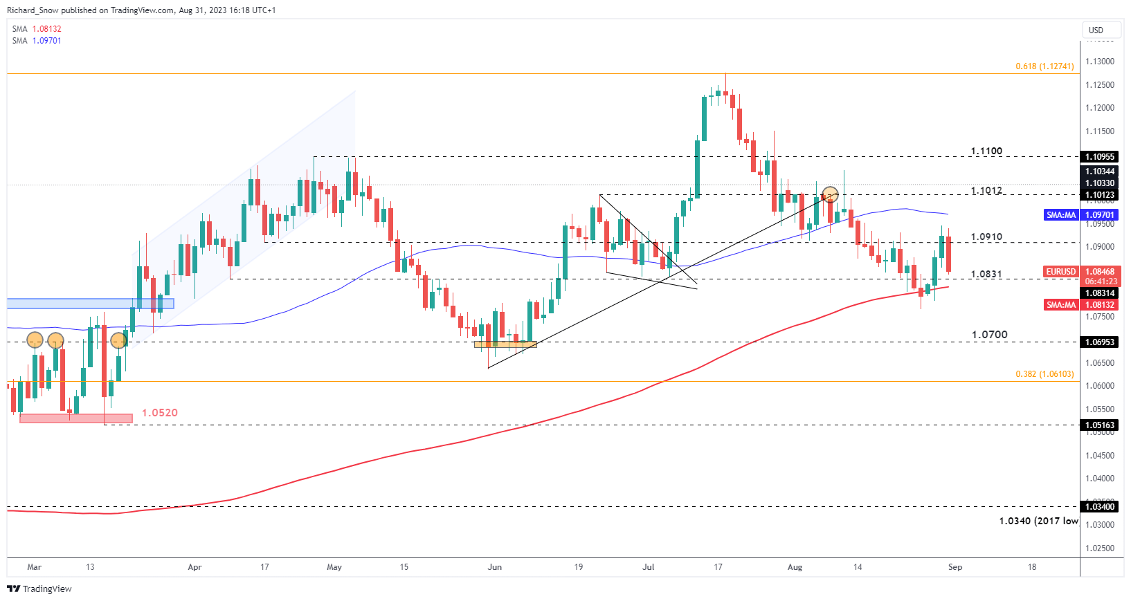 EUR/USD NEWS AND ANALYSIS Mixed EU inflation and cautious ECB tone add to downside risks EUR/USD appears vulnerable – will the 200 SMA hold? Institutional positioning remains heavily net-long, opening up risk of sustained EUR/USD selloff The analysis in this article makes use of chart patterns and key support and resistance levels. For more information visit our comprehensive education library MIXED EU INFLATION AND CAUTIOUS ECB TONE ADD TO DOWNSIDE RISKS The euro sold off on Thursday after markets chose to pay close attention to the more encouraging core inflation print for the Euro area, as opposed to the slight move higher on headline readings. Core inflation printed at 5.3%, in line with expectations but represents a move lower from last month’s 5.5% print. In addition, recent communication from ECB rate setters suggests that a more cautious approach will be adopted by the governing council ahead of next month’s central bank meeting. In the moments before Christine Lagarde addressed delegates at Jackson Hole, unknown ECB ‘sources’ suggested that hawks within the committee have eased their previous stance which could see the group err on the side of caution should the decision to hike or hold be finely balanced. Earlier today, well-known hawk Isabel Schnabel Elsewhere, US PCE data printed in line with market consensus for both the core and headline readings and both measures recorded a rise on the prior month’s year-on-year comparison. Markets now look to tomorrow’s NFP report which attracts even more anticipation than before, given the build up of lower impact jobs data in the lead up. EUR/USD APPEARS VULNERABLE – WILL THE 200 SMA HOLD? The EUR/USD pair declined on Thursday after European core inflation edged lower and US PCE remained elevated. The pair briefly traded above 1.0910 before surrendering all of yesterday’s gains. Immediate support now appears at 1.0831, followed closely by the 200 day simple moving average (SMA). Thereafter, 1.0700 comes into view, however, that remains a fair distance off for now. Of course it is worth noting year end flows can play a part in price discovery today so that always needs to be taken into account. The difficulty with EUR/USD right now is you have vulnerability appearing across both currencies. The dollar has weakened amid slower GDP outperformance (outperformance nonetheless) and early signs of a softer jobs market – something the Fed has eyed as crucial to bringing inflation down to the 2% target. Downside risks have also accrued for the euro amid broadly declining inflation, and growth concerns that appear to be weighing on ECB members ahead of the rate decision next month. Resistance is back at 1.0910 followed by 1.1012 - the June 2023 high. EUR/USD Daily Chart Source: TradingView, prepared by Richard Snow The weekly chart shows the relentlessness of the medium-term selloff which too place over six consecutive weeks. The pair has tagged channel support and has risen this week, although, gains are rapidly being clawed back ahead of NFP. This level of support remains a big test for EUR/USD bears – one to keep an eye on heading into the end of the week. EUR/USD Weekly Chart Source: TradingView, prepared by Richard Snow INSTITUTIONAL POSITIONING (HEDGE FUNDS, MONEY MANAGERS) FROM THE COT REPORT Euro positioning remains strongly net-long, something that could soon change depending on incoming data and will certainly be tested in the lead up to the ECB’s September meeting. The CoT report gathers positioning data from reportable speculators like hedge funds and other large money managers. Source: Refinitiv, prepared by Richard Snow https://www.dailyfx.com/news/eur-usd-price-outlook-euro-risks-accumulate-ahead-of-nfp-20230831.html