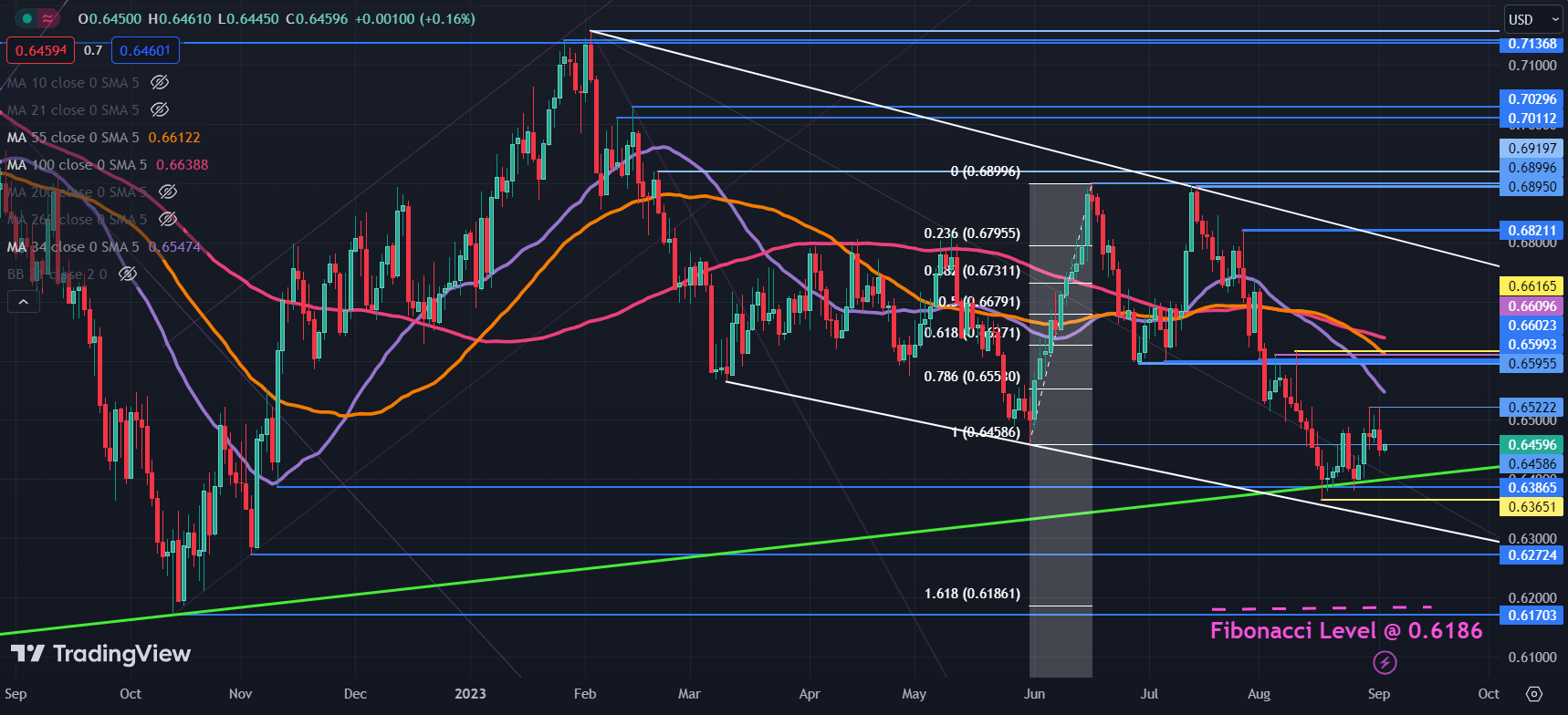 The Australian Dollar bounced off some trend lines last week The RBA appears certain to be on hold tomorrow as the guard prepares to change GDP data and China relationships may provide some impetus. The Australian Dollar is steady near 0.6450 going into Monday’s trading session ahead of the Reserve Bank of Australia’s rate decision tomorrow and then GDP data on Wednesday. Tuesday’s RBA monetary policy committee meeting will be the last chaired by Governor Philip Lowe as he will be passing the baton to Michele Bullock later this month. Interest rate markets anticipate that the bank will keep rates on hold at 4.10% for the third month in a row after raising them by 400 basis points since May 2022. A Bloomberg survey of economists supports this perspective. The decision can be watched live here. Last week, the incoming Governor made it clear that future rate decisions are a meeting-by-meeting scenario and data-dependent. The market is currently not pricing in any more hikes in this cycle and is looking for cuts in the cash rate at the back end of 2024. On Wednesday, 2Q quarter-on-quarter GDP is forecast to be 0.3% against 0.2% previously. Annual GDP to the end of July is anticipated to be 1.8% against the prior read of 2.3% as the base effect kicks in. The US are on holiday today and market conditions could be skittish overnight on less liquidity. Elsewhere, the ASEAN 2023 summit gets underway in Jakarta tomorrow. It is being reported that Australian and Chinese officials will be meeting on the sidelines for the first time since 2020 when relationships soured. Although there are not expected to be any major announcements, the thawing of tension between the nations might be seen as a positive step by the markets. AUD/USD DAILY CHART AUD/USD appears to be at somewhat of a crossroads. It has consolidated after bouncing off a long-term ascending trend line but remains in a shorter-term descending trend channel. The price remains below the 34-, 55- and 100-day Simple Moving Averages (SMA) which may suggest that bearish momentum is intact for now. The 0.6600 - 0.6620 area seems to be shaping up as a notable resistance zone with several breakpoints and prior peaks there. The 100-day SMA is currently just above there, near 0.6640 and if it clears that, it might indicate that the overall range trade scenario is intact for now. To learn more about range trading, click on the banner above. On the downside, support may lie at the breakpoints and previous lows of 0.6386, 0.6365, 0.6272 and 0.6170. The latter might also be supported at 161.8% Fibonacci Extension level at 0.6186. To learn more about Fibonacci techniques, click on the banner below. https://www.dailyfx.com/news/australian-dollar-steadies-ahead-of-rba-and-gdp-will-aud-usd-get-a-grip-20230904.html