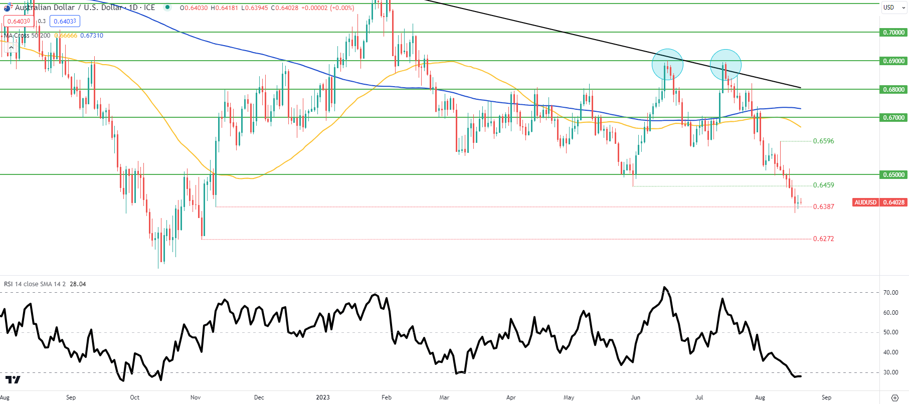 AUD/USD ANALYSIS & TALKING POINTS Lack of Chinese stimulus weighs on Aussie dollar. RBA’s higher for longer > Federal Reserve. Turnaround or continuation for AUD/USD? AUSTRALIAN DOLLAR FUNDAMENTAL BACKDROP The Australian dollar is trading at extreme levels this Monday as the PBoC decided to modestly reduce interest rates (see economic calendar below) on the 1-year LPR while keeping the 5-year rate on hold. This unexpected outcome resulted in the pro-growth AUD weaker against the US dollar despite the DXY marginally lower for the day. Pricing today across FX markets are relatively subdued with investor uncertainty increasing due to key upcoming risk events including the BRICS summer and Jackson Hole Economic Symposium. With Jackson Hole being the focal point as Fed Chair Jerome Powell could alter the current ‘higher for longer’ narrative, potentially providing some support for the fading Aussie dollar. AUD/USD ECONOMIC CALENDAR (GMT +02:00) Source: DailyFX economic calendar Looking at money market pricing for the Reserve Bank of Australia (RBA) below, expectations for a rate cut does not look to be priced in for 2023 or 2024 unlike the Fed who is forecasted to cut around May of 2024. Should Fed Chair Jerome Powell push a more accommodative stance this week, this interest rate differential may further augment any AUD upside. TECHNICAL ANALYSIS AUD/USD DAILY CHART Chart prepared by Warren Venketas, TradingView Daily AUD/USD price action continues to hover around the 0.6387 swing support and a daily confirmation candle close could spark another leg lower towards the November 2022 low at 0.6272. That being said, the Relative Strength Index (RSI) is now in oversold territory and could indicate a possible end to the recent downtrend although moving against the prevailing trend carries a high degree of risk. Investors may want to wait for the fundamental drivers to take place before entering the market as Jackson Hole traditionally carries significant price swings. Trader hesitancy has already commenced with the latest slew of doji candlesticks that could point to a pause before a resumption of the downtrend or a shift. Key resistance levels: 0.6596 0.6500 0.6495 Key support levels: 0.6387 0.6272 IG CLIENT SENTIMENT DATA: BULLISH (AUD/USD) IGCS shows retail traders are currently net LONG on AUD/USD, with 81% of traders currently holding long positions. Download the latest sentiment guide (below) to see how daily and weekly positional changes affect AUD/USD sentiment and outlook. https://www.dailyfx.com/news/forex-aud-price-forecast-no-respite-for-aussie-after-reserved-china-rate-cut-wv-20230821.html