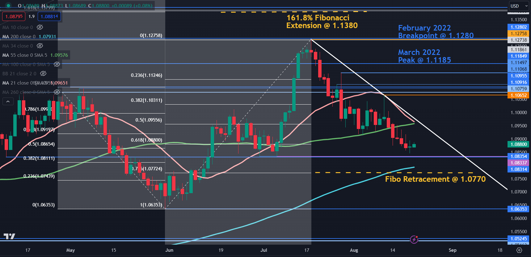 Euro, EUR/USD, US Dollar, Fed, Jackson Hole, China, PBOC, HSI, Crude Oil, Gold - Talking Points Euro support has held so far but may falter if the US Dollar resumes strengthening China eased monetary policy today, but not by enough looking at the price response Markets are now eyeing the Fed’s Jackson Hole symposium. If they’re hawkish, will EUR/USD break lower? The Euro steadied to start the week as it pauses in its recent run lower on the back of the US Dollar regaining its ascendency this month. Most of the other major currency pairs have also had a slow Monday so far. The Federal Reserve meeting minutes for the July gathering opened the door to a potential hike in the target rate going into the end of the year. Later this week the Kansas City Fed will host its annual Jackson Hole Economic Symposium. For the near term, the market will be looking for clues on the September Federal Open Market Committee (FOMC) rate decision. The podium at this event also lends itself for notable adjustments in the bigger picture for the Fed. As a result, Fed Chair Jerome Powell’s speech will be closely watched by the market this Friday. The People’s Bank of China (PBOC) eased monetary policy today by 15 basis points (bp) for the 1- and 5-year loan prime rate. They ended up moving the 1-rate by only 10 bp to 3.45% and kept the 5-year rate unchanged at 4.20%. Earlier today the People’s Bank of China (PBOC) eases monetary policy, moving the 1-year loan prime rate by only 10 basis points to 3.45% and kept the 5-year rate unchanged at 4.20%. The market had been anticipating a 15 bp cut for both instruments. Hong Kong’s Hang Seng Index (HSI) plunged on the news, trading more than 1.8% at one stage. Other APAC equity indices are generally, except for Japan, that saw modest gains. Crude oil has found firming footing with the WTI futures contract is nearing US$ 82 bbl while the Brent contract is a touch above US$ 85 bbl. Spot gold remains below US$ 1,900 and has been oscillating around US$ 1,890 today. Looking ahead, the US will see some existing home sales adata and a number of Fed speakers will be crossing the wires. EUR/USD DAILY TECHNICAL ANALYSIS SNAPSHOT EUR/USD remains below a descending trend line but has stalled in its bearish run just above a potential support zone in the 1.0830 – 1.0835 area where there are some breakpoints and prior lows. Support could also be near the 78.6% Fibonacci Retracement levels at 1.0770 which is just above the 200-day simple moving averages (SMA). Ahead of that level, some prior lows and the breakpoint in the 10830- 1.0835 area may provide support. If EUR/USD was to rally and approach the descending trend line, there could be resistance at the 21- and 55-day SMAs just ahead of it. Potential resistance might also be offered in the 1.1065 – 1.1095 area where several historical breakpoints reside along with a recent high and just ahead of the psychological level at 1.1100. Further up, resistance could be at the breakpoint from the March 2022 high at 1.1185 or the recent peak at 1.1275, which coincides with two historical breakpoints. Above those levels, resistance might be at the Fibonacci Extension of the move from 1.1095 to 1.0635 at 1.1380. Just above there are some more breakpoints in the 1.1385 – 95 area. https://www.dailyfx.com/news/euro-steadies-as-hang-seng-tanks-on-pboc-s-shallow-cut-lower-eur-usd-20230821.html