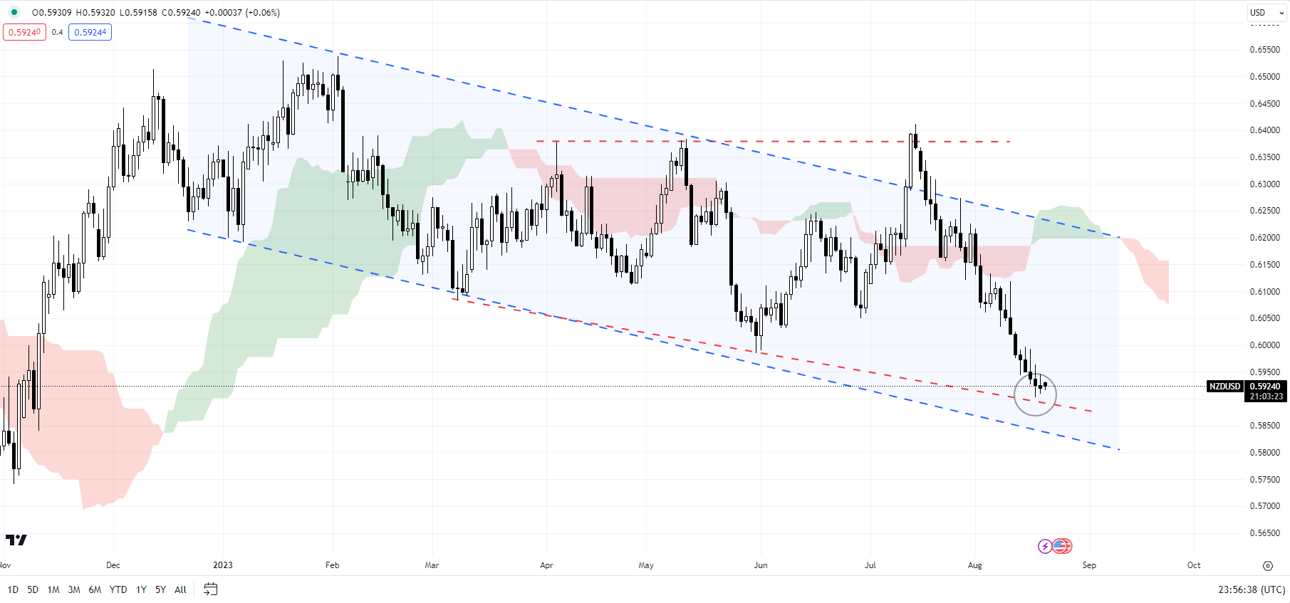 NZD/USD, AUD/NZD, GBP/NZD - OUTLOOK: China cut its 1-year benchmark lending rate but left is 5-year rate unchanged. NZD gave up early gains, with NZD/USD testing key support. What is the outlook for NZD/USD, GBP/NZD, and AUD/NZD? The New Zealand dollar gave up early gains against its peers after China cut its one-year benchmark lending rate but left its five-year rate unchanged. The one-year benchmark lending rate was cut by 10 basis points, while the five-year rate was left unchanged, contrary to expectations for 15 basis-point cuts to both. Over the weekend, China pledged to coordinate financial support to resolve local government debt problems. Local government finances have worsened due to the prolonged weakness in the property sector, causing a credit crunch for a number of developers. Last week, China unexpectedly lowered key policy rates for the second time in three months in a bid to revive the faltering post-Covid economic recovery, rising deflation risks, and tightening credit conditions. NZD/USD Daily Chart Beijing has announced a series of measures in recent months to cushion some of the downside risks to the economy, including cuts in key lending benchmarks, targeted measures toward the property sector aimed at the supply side, and signaled the end of the years-long crackdown on the technology sector. Many are awaiting additional measures for the struggling property sector addressing the demand side and infrastructure. China is New Zealand’s largest trading partner, and any improvement in China’s growth prospects bodes well for NZD. NZD has been underperforming against some of its amid deteriorating NZ economic growth outlook for the current year and the belief that NZ interest rates have peaked. Last week, the Reserve Bank of New Zealand (RBNZ) kept its cash rate steady, as expected, but slightly pushed out when it expects to start cutting interest rates to 2025. NZD/USD: At the lower edge of the support On technical charts, NZD/USD looks oversold as it tests support on a downtrend line from March, slightly above the bottom end of a downtrend channel from the beginning of the year. There is no sign of reversal yet, and NZD/USD would need to rise above the end-June low of 0.6050 for the immediate downward pressure to ease. GBP/NZD Monthly Chart GBP/NZD: Testing a tough barrier GBP/NZD is testing a key converged hurdle at 2.10-2.20, including the 200-month moving average, coinciding with a downtrend line from 2007, and the 2020 high of 2.18. This resistance is very important, and a decisive break above could clear the path toward the 2015 high of 2.46. AUD/NZD Weekly Chart AUD/NZD: Well within the range AUD/NZD continues to trade sideways, but well within the lower edge of a rising pitchfork channel from last year. The broader range established is 1.05-1.11, but most recently the range has narrowed to 1.07-1.09. A break above 1.11 or a break below 1.05 is needed for AUD/NZD to start trending. https://www.dailyfx.com/news/new-zealand-dollar-reverses-gains-after-pboc-move-nzd-usd-aud-nzd-gbp-nzd-setups-20230821.html
