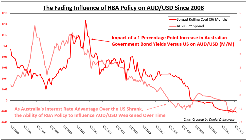 UNDERSTANDING AUSTRALIAN DOLLAR FUNDAMENTAL BIAS – EDUCATIONAL REPORT: The Australian Dollar is influenced by sentiment, commodity prices and monetary policy From 2011 - 2023, RBA vs Fed policy became a poorer predictor of AUD/USD direction More focus was placed on financial market sentiment heading into the global pandemic The surge in Australia’s trade balance post-Covid made commodities a key AUD driver Like other exchange rates, AUD/USD can be influenced by the difference in relative monetary policy, which in this case is between the RBA and the Fed. But that alone is one of the many ingredients that drive the direction of the Aussie. Financial markets are constantly adapting to changing economic environments. That also means the importance of what impacts the Australian Dollar changes over time. For example, another ingredient that influences AUD/USD is financial market sentiment. That is because Australia finds itself sitting at the front end of the global supply chain, or in other words, the world business cycle. That is why you will often see the exchange rate being influenced by stock markets, especially those related to Emerging Markets. China is Australia’s largest trading partner, and the latter heavily exports commodities to the former. That also means that understanding the dynamics of commodity prices is another factor that determines Australian Dollar direction. This means three vital ingredients are impacting the exchange rate: relative monetary policy, market sentiment and commodity prices. With that in mind, this is a special report that focuses on trying to understand how the influence of these variables on the Australian Dollar changed from 2006 up until the middle of 2023. The purpose of the study will be to demonstrate why it is important to adapt fundamental analysis to constantly changing environments. With that in mind, let us cover how this was performed. How the Study Was Conducted Rolling regression modeling over a 36-month window in steps was used on the following variables (all of which were expressed in month-over-month form): AUD/USD, the spread between Australian and United States 2-year government bond yields, the MSCI Emerging Markets Index (EEM) and the Bloomberg Commodities Index (BCOM). Doing this created explanatory coefficients that changed in influence over time. It should also be noted that to gauge underlying relationships, a few data outliers were removed. If you are interested, a full analysis of how this was performed was outlined in a Twitter thread. How Has RBA & Fed Policy Divergence Been Influencing AUD/USD? We will start with the importance of relative monetary policy. The dark red line on the chart below is the rolling bond yield spread coefficient and how it changed over time. When this line is rising above 0, that means a 1 percentage point improvement in 2-year bond yield returns in Australia relative to the United States produced an increasingly more positive reaction from AUD/USD (m/m), controlling for EEM and BCOM. In other words, increasingly higher interest rates in Australia relative to the United States typically means stronger Aussie appreciation. What you may notice is that the dark red line has been falling steadily since 2011 and turned slightly negative around the time of 2020. When the dark red line is at 0, that means there is practically no relationship between AU-US bond yield spreads and AUD/USD. So, what happened to this relationship? The yield advantage that Australia once had relative to the United States slowly evaporated after the 2008 Financial Crisis (light red line), turning negative heading into Covid and remaining mostly thereafter. In other words, interest rates in the US became higher than in Australia. As this happened, the ability of RBA monetary policy to influence AUD/USD (through setting interest rates) weakened significantly and remained so in the few years after Covid. How Has Emerging Market Sentiment Been Impacting AUD/USD? While RBA policy became an increasingly poorer predictor of AUD/USD, Emerging Market sentiment became more important. The dark green line on the chart below is the rolling EEM coefficient. When this line is rising above 0, a 1 percentage point boost in monthly Emerging Market performance shows increasingly better returns in AUD/USD (m/m), controlling for bond yield spreads and BCOM. I have overlaid this with G4 central bank balance sheet assets. What you can see is that as major central banks injected liquidity into the financial system after the 2008 recession, sentiment became an increasingly better predictor of the Aussie exchange rate. But, you might notice that the dark green line peaked just before Covid and stayed lower thereafter despite the surge in asset holdings. That would speak to less influence from market sentiment driving AUD/USD in the post-Covid era (although the relationship remained positive). Let us take a closer look at why this happened. What About Commodity Prices? The dark blue line on the chart below is the rolling BCOM coefficient, zoomed in on just 2016+. When this line is rising increasingly above 0, a 1 percentage point boost in the BCOM Index tends to elicit a stronger positive effect on AUD/USD (m/m), controlling for bond yield spreads and EEM. What is very interesting is that the dark blue line surged higher heading into Covid and remained elevated thereafter. This is as Australia’s trade balance exploded during Covid, meaning the value of the nation’s exports became significantly larger than its imports. In other words, as commodity prices surged, benefiting Australia, AUD/USD paid more attention to the BCOM Index and less so to EEM and AU-US bond yield spreads. A Closer Look at Post-Covid The last chart below plots the EEM and BCOM coefficients zoomed in on 2016+. The reason this was performed is to visualize the evolution of AUD/USD underlying fundamental dynamics during Covid. Specifically, you can see how entering the pandemic, 