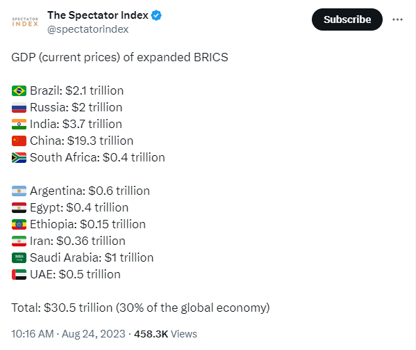 USD/ZAR PRICE, ANALYSIS AND CHARTS: USD/ZAR Rises Despite BRICS Expansion Plans, Dollar Bulls Return. BRICS Bloc Has Extended an Invitation to 6 Countries to Join the Bloc with Saudi Arabia the Surprise. The BRICS Bloc Has Bold Ambitions but a Lot of Work Lies Ahead to Bring the Vision to Reality. The First Steps are Definitely Positive for the Bloc as it Looks to Challenge the Established Global Order. The South African Rand (ZAR) has been enjoying an excellent run of late thanks to a combination of factors. That run has come in for a slight reprieve today as the USD regained some momentum with USDZAR up 1.24% on the day and back above the 18.50 mark. BRICS SUMMIT AND EXPANSION PLANS The BRICS Summit finally kicked into serious mode today with the BLOC confirming it has extended invitations to 6 countries while leaving the door open to further expansion. Among the countries mooted for the Blocs first expansion include Iran, Argentina, Ethiopia, Egypt, UAE and of course the big name in Saudi Arabia. What is intriguing about the announcement is the historically close ties between Saudi Arabia and Egypt with the powers that be in Washington DC, and how any decision to join BRICS may affect the relationship dynamics between the nations. GDP (at Current Prices) of the Expanded BRICS Bloc Source:Twitter South African President Cyril Ramaphosa stated that the Bloc has embarked on a new chapter in an effort to build a world that is fair, just and inclusive and prosperous. South Africa remains the smallest economy in the current BRICS make-up and with powerful countries set to join it will be interesting to see if the Southern African Nation loses any clout in the Bloc, a fear first brought up by Brazil. Both countries today however seemed to be looking forward to the expansion with both Brazilian President Lula and SA counterpart Ramaphosa stating that this is the first phase of the expansion with others likely to follow. In response to the invite Ethiopian Prime Minister Abiy Ahmed called the decision ‘a great moment’ while UAE President Mohammed bin Zayed said he appreciated the inclusion of his country. Also in attendance today was the United Nations Secretary-General Antonio Guterres who echoed a recurring plea by BRICS for reforms of institutions like the U.N. Security Council, the International Monetary Fund and World Bank, stating that global governance structures "reflect yesterday's world". Indian Prime Minister Narendra Modi said the expansion and modernization of BRICS is a message that all institutions in the world need to mold themselves according to changing times. Despite all the positivity around the announcement there was fierce debate around the size and speed of the expansion among members and it will be interesting to gauge the groups dynamics moving forward. The inclusion of Saudi Arabia in particular is likely to accelerate talk of de-dollarisation. As mentioned above the Kingdom had been mooted as a possible member but the geopolitical implications as well as its relationship with the West made the prospect even more intriguing. The move will now spark debate about the use of local currencies for trade among the Bloc specifically when it comes to crude oil. The addition of Saudi Arabia, Iran and UAE would see the group make up almost 42% of the global crude oil output. However as mentioned previously de-dollarisation is a complex topic given the makeup of global markets. Saudi Arabia may be viewed as the key given the Kingdoms position in global oil trade. Despite discussions with India and China about accepting payment in Rupees and Yuan the Saudis have thus far remained stubborn which may have something to do with the Saudi Riyal being pegged to the US Dollar. Interesting times ahead indeed but the expansion does certainly pave the way for more serious talk around de-dollarisation. The task of accomplishing that, however, is another story altogether and would require time, willpower, diplomacy and the willingness of the BRICS Bloc to put the Group first at times if it wishes to achieve de-dollarisation. JACKSON HOLE AND US DOLLAR RISK As the BRICS summit comes to a close all eyes are now on the Jackson Hole Symposium which will play host to Central Bankers from the G7 in Wyoming, United States. Last year the symposium focused on the growing challenge of inflation and the impact saw volatility and fireworks across markets, something Central Bankers would like to avoid this time around. The reason I say this is given the recent uncertainty around China and further downgrade to US Banks by S&P Global earlier this week coupled with dire set of PMI data from Europe and the US we could see a more cautious and pragmatic approach from Central Banks. The US Dollar continues to surprise at the minute supported by the rise in US yields as well as some safe haven demand thanks to ongoing uncertainty. Following a bout of weakness yesterday the Dollar Index resumed its advance today with USDZAR rebounding following a brief stint below the 18.50 handle. Any comments from Central Bankers at Jackson Hole have the potential to cause a ripple effect in markets with volatility to be expected heading into the weekend. FINAL THOUGHTS AND TECHNICAL OUTLOOK USDZAR from a technical standpoint has always fascinated me as we tend to trend for a sustained period of time. Looking back historically and trends seem to run for 3-4 months at a time before we see a significant change in the overall trend of the pair. This is something which has continued this year with the upside rally beginning on February 2 from the lows around the 16.9200 mark all the way to the 19.9200 mark on June 1. Looking ahead and the drop this week toward support around the 18.50 handle was met with significant buying pressure with USDZAR up around 1.78% at the time of writing, trading at 18.77. Support was provided by a combination of the 50 and 100-day MA with immediate resistance on the upside around the 19.00 handle. F
