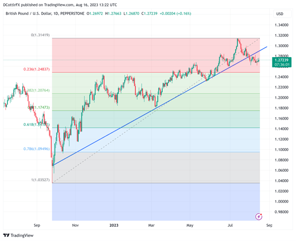 GBP/USD PRICE, CHART, AND ANALYSIS GBP/USD rose and stayed up after the latest official UK consumer price numbers Headline CPI is decelerating but remains hugely above target The prospect of higher rates next month remains The British Pound rose against the United States Dollar on Wednesday as the latest official inflation report did nothing to allay suspicions that the Bank of England will be raising interest rates yet again, probably as soon as next month. While July’s headline 6.8% annualized Consumer Price Index rise was much lower than June’s 7.9%, it was exactly as markets had expected and, crucially, still more than three times the BoE’s 2% target rate. That hasn’t been hit since 2021. For sure there were crumbs of comfort in the numbers. That headline rate was a seventeen-month low and the nightmare days of late last year, when inflation was printing double digits, seem to be over. However, the ‘core’ inflation rate, which strips out the volatile effects of food and fuel prices, was stickier than the headline. It came in at 6.9%, a tick above forecasts and unchanged from June. The message in the data seemed clear enough for a country that has already struggled longer and harder with inflation than most comparable economies: price-rises are decelerating, but they’re not doing so fast enough. That in turn strongly suggests that the monetary screws will have to be tightened again, after fourteen consecutive monthly interest-rate increases so far which have taken the key Bank Rate up to 5.25%. Moreover, the figures followed extremely strong wage data released on Tuesday. They suggest that ‘cost push’ inflation remains a huge factor in overall price rises, even as past inflationary bugbears such as fuel prices relax a little. The BoE’s Monetary Policy Committee expects to see inflation falling to 4.9% by the end of this year, according to its last forecasts, but markets will be very interested to see how the latest numbers fit with that view. They’ll have a bit of a wait to find out, as UK borrowing costs won’t be reviewed again until September 21. Still, hopes for another increase have kept Sterling bid, with the UK economy’s surprising resilience also helping. The Pound has risen quite consistently against the greenback since last September, largely on the thesis that the BoE has more heavy-lifting work ahead of it than the Fed if it’s going to bring inflation to heel. It’s safe to say that thesis has survived Wednesday’s inflation figures. It's been a busy week for UK data, but GBP/USD is likely to be dominated by economic events across the Atlantic, at least until Friday when official retail sales numbers will shine more light on the Pound’s domestic economy. GBP/USD TECHNICAL ANALYSIS GBP/USD Daily Chart Compiled Using TradingView GBP/USD remains well short of July’s fifteen-month highs and, perhaps more worryingly for Sterling bulls, below an important trend line previously in place since the lows of September last year. However, the Pound hasn’t fallen very far from those peaks, and it remains comfortably above even the first Fibonacci retracement of the rise up from those September lows to that July peak. That comes in at 1.24837. In the near term the pair faces resistance at 1.2770. It will take a convincing and sustained break of that to power it back above that trend line which now provides resistance at 1.29816. The outlook for this pair is a little ill-defined at present, but the fact that it’s below both its 50 and 100-day moving averages suggests that some caution is due for sterling bulls, at least in the near term. The Pound could also be very close to forming a ‘head and shoulders’ on the daily chart, which would suggest that it had topped out significantly with that July rise. The uncommitted may be well advised to wait and see whether the pair can hold above its retracement levels as convincingly in the week ahead. https://www.dailyfx.com/news/gbp-usd-rises-sticky-uk-inflation-says-boe-has-more-to-do-20230816.html