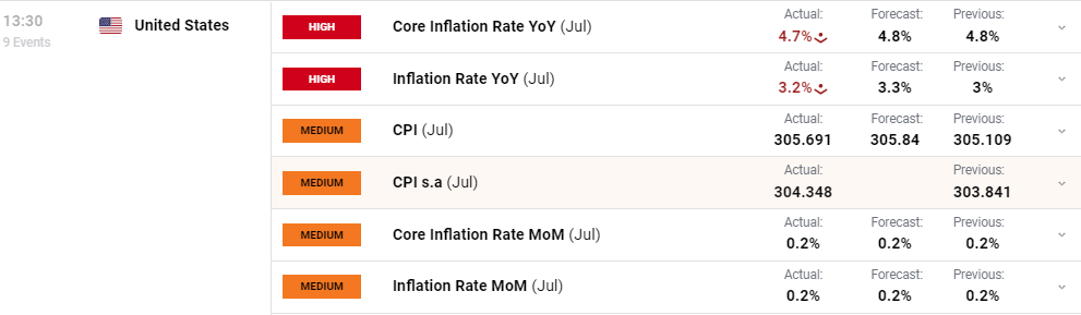 US DOLLAR (DXY) PRICE, CHART, AND ANALYSIS The US dollar sheds half a point after the CPI release. Headline inflation rises by less than expected. Core inflation fell and headline inflation rose by less than expected in July, according to the latest US Inflation Report. Core inflation fell to 4.7% y/y, the lowest level since October 2021, while headline inflation rose from 3% to 3.2% but missed market expectations of 3.3%. Bureau of Labor Statistics Release The marginally better-than-expected report sent the US dollar lower by around 50 pips as further rate hike expectations eased a fraction. EUR/USD touched 1.1065 before retreating back to 1.1035 at the time of writing, while GBP/USD clipped 1.2820 before falling back to 1.2775. Interest-rate sensitive gold rose to $1,930/oz after opening Thursday at $1,914/oz. before slipping back to $1,925/oz. The US dollar (DXY) currently trades at 102.02 after opening the session at 102.489. US DOLLAR (DXY) DAILY PRICE CHART – AUGUST 10, 2023 https://www.dailyfx.com/news/breaking-news-us-dollar-slips-after-inflation-data-miss-forecasts-20230810.html