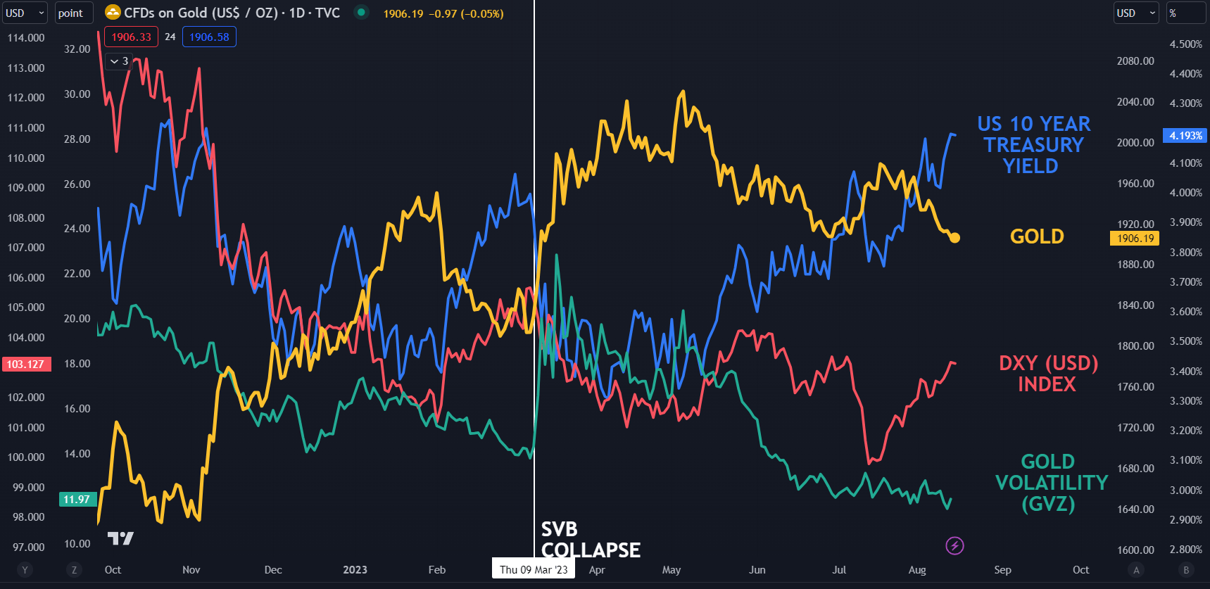 Gold, XAU/USD, US Dollar, China, Yuan, Treasury Yields, DXY Index, GVZ - Talking Points The gold price headwinds persist as Treasury yields push higher, boosting USD The PBOC has adjusted policy as the outlook for China faces challenges Volatility remains low but has inched up slightly. If it goes higher, where to for XAU/USD? The gold price continues to languish going into Tuesday’s trading session as the US Dollar pursues higher ground, assisted by rising Treasury yields. The metals complex is generally weaker across the board, impeded by the stronger Dollar and deteriorating appetite for risk and growth-orientated assets. Industrial metals have been hit harder than the yellow metal with the outlook for China facing increased scrutiny. Generally weaker economic data there last week has been compounded by property groups Country Garden and Ocean Sino missing debt payments. Country Garden defaulted on US Dollar coupon payments last week and this week saw trading in its onshore debt suspended alongside Ocean Sino. The market is awaiting concrete action from authorities to deal with the economic uncertainty. A plethora of Chinese data will be closely inspected for further clues on the state of the world’s second-largest economy. The details can be viewed here. The People’s Bank of China (PBOC) fixed the Yuan stronger today at 7.1768 per USD. The bank also cut the medium-term lending facility rate to 2.50% from 2.65%. While that is unfolding, the benchmark 10-year Treasury note is surging above 4.20% for the first time since November last year after dipping to 4.73% a month ago. The Treasury curve seems more firmly anchored with the market now viewing the Federal Reserve as near the end of its tightening cycle. The 2-year bond is nearing 5.0%, still some way from the peak of 5.11% seen last month. This appears to have underpinned the DXY (USD) index. At the same time, forward-looking gold volatility has been languishing of late, but it has inched up in the last few trading sessions. This may hint toward some uncertainty within the market and a significant move in price might be in the offing. The GVZ index is a measure of implied volatility for gold that is calculated in a similar way to the VIX index’s interpretation of volatility for the S&P 500. Looking ahead, the precious metal has held up reasonably well given the state of play, but if these headwinds persist it could be further undermined. SPOT GOLD AGAINST US 10-YEAR TREASURY YIELD, DXY (USD) INDEX AND GVZ INDEX https://www.dailyfx.com/news/gold-price-loses-its-lustre-as-the-us-dollar-and-treasury-yields-climb-lower-xau-usd-20230815.html