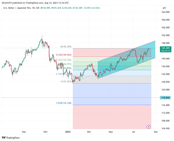 JAPANESE YEN (USD/JPY) ANALYSIS AND CHARTS USD/JPY Posts new 2023 high as risk aversion, yield differentials boost the Dollar Key 145 region now in play The Bank of Japan bought Yen above this point in 2022 The Japanese Yen weakened further against the United States Dollar as a new trading week kicked off on Monday, taking USD/JPY into a region that saw ‘intervention’ action from the Bank of Japan to curb Yen weakness back in 2022. The pair charged back above the psychologically important 145.00 handle, posting a new high for this year of 145.40 in the process. The last time it topped this point was in September 2022, when the Dollar’s rise eventually saw the BoJ stepping in to bring the pair back down, buying Yen directly for the first time since 1998. The market will accordingly be back on intervention watch whenever the pair creeps back above the 145 line, with HSBC reportedly suggesting that BoJ action can be expected in the 145-148 band. Bank of Japan (BoJ) - Foreign Exchange Market Intervention The latest move was part of a general bout of Dollar strength, with the greenback supported by rising Treasury yields and some broad risk aversion. Asian stocks were buffeted by new concerns about the ailing Chinese economy. With demand sluggish and deflation taking hold in the world’s second-largest economy, secondary effects are now being felt. Worries about the debt-laden real estate and construction sectors are nothing new, but on Monday came news that property-development giant Country Garden had suspended trade in eleven of its onshore bonds. This in turn prompted speculation that the company will have to restructure its debts, with its shares falling 16% in Hong Kong. There were also some concerns about Typhoon Lan, which is expected to make landfall in Japan on Tuesday. Air and rail travel is already seeing restrictions. The Bank of Japan offered unlimited Japanese Government Bonds with residual maturities of between five and ten years on Monday, part of its policy of Yield Curve Control. Tuesday will see the release of official Gross Domestic Product numbers out of Japan for the second quarter of this year. A modest increase is expected for the annualized growth rate. That’s tipped to come in at 3.1%, above the 2.7% seen in the first three months. The on-quarter rate is expected to have ticked up to 0.8%. As-expected data would suggest that the economy continues to recover from the Covid pandemic, albeit at a quite modest rate. The BoJ wants to see a durable return of domestic demand before it unwinds its outlying loose monetary policy. USD/JPY TECHNICAL ANALYSIS USD/JPY Daily Chart USD/JPY has seen a renewed bout of strength since late July but this is merely the latest move in a well-respected broad uptrend channel in place since March. Monday’s trade has seen initial resistance at 145.258 topped, but it remains to be seen whether Dollar bulls can hold above that on a daily close basis. If they can, they’ll be looking at more resistance points from November 2023, the last time the pair pushed up this high. The 146.414 region, from which the Dollar slid on November 9 last year now comes in as resistance. There’s likely support at 143.26, Aug 2’s intraday top, and, well below that, there’s initial Fibonacci retracement support at 141, defending channel support at 139. 202. Those last two levels don’t seem in immediate danger but a market wary of central bank intervention will keep them in mind. As Monday’s European session fades out, the Dollar is hovering around the psychologically important 145.50 level. A close above that will probably embolden bulls to try and push on higher, although the broader market may suspect that the Dollar is becoming a little overstretched, at least in the short term. Retail trader data shows 19.91% of traders are net-long with the ratio of traders short to long at 4.02 to 1. https://www.dailyfx.com/news/japanese-yen-jpy-clobbered-to-new-23-lows-skirts-intervention-zone-20230814.html